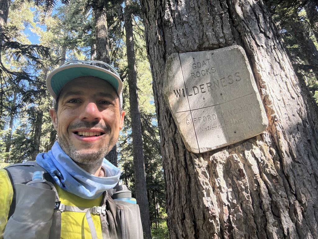 I left Mt Adams and continued through the Goat Rocks Wilderness, with a sweltering climb to the ridge below Old Snowy. I started eating all meals on the move, after sitting down to eat for the first couple of days. I popped some blisters that were forming on both feet. After having strong and joyful mornings with lots of positive thoughts descend into really difficult afternoons and evenings for the first two days, on this day I passed through the early high and afternnoon low point to rebound after dinner feeling strong and happy. I continued moving slightly later into the evening and ended my day just south of White Pass.