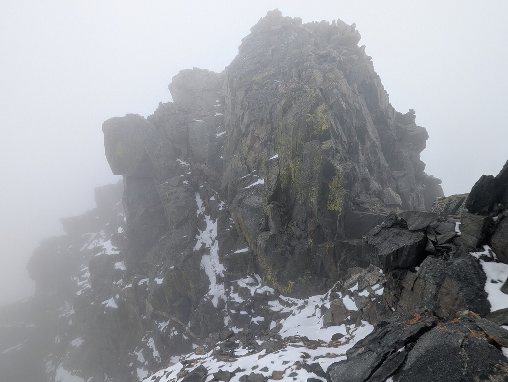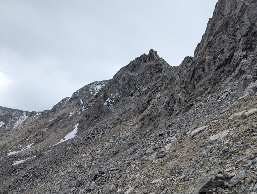 Conditions on the day were pretty horrendous for September. I solidified plans a few days out based on the forecast showing no more than 5% chance for precipitation chance for a couple hours on Saturday afternoon. I knew there would be some lingering fresh snow on northern aspects, but correctly predicted that the majority of the route would be dry by Saturday morning. What I didn't anticipate was on-and-off light snowfall all day Saturday and into the early hours on Sunday. While I'll gladly take this over thunderstorms, it resulted in incredibly slippery conditions whenever the sun (often) went away, including all of Saturday night/Sunday morning. I probably lost the better part of an hour just clambering over wet rocks in otherwise easy terrain.