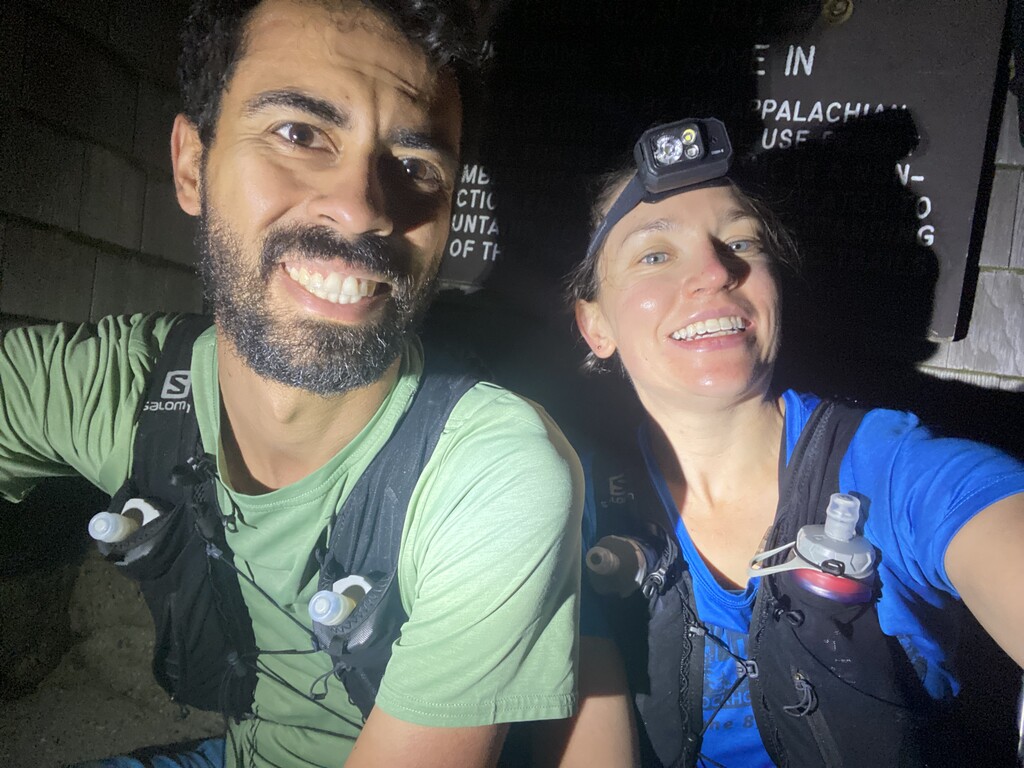 Lonesome Lake Hut (03:36): we spend far too long trying to take a picture in front of the sign. You can see the unhinged result 🙂↔️. I blame rami for choosing to nap more over coming up with us to take the photo from below the stairs as he’d done last time. A quick rest at the tables, trying to process what it means to finish the traverse 2 miles up into the woods from our car, and we set back down on an even slower death march than we’d come up. Before we were motivated by an arbitrary cutoff of 24 hours but now it was simply a matter of choosing to sleep on the car ride home vs on the side of this trail. I contemplated the second option a few times…