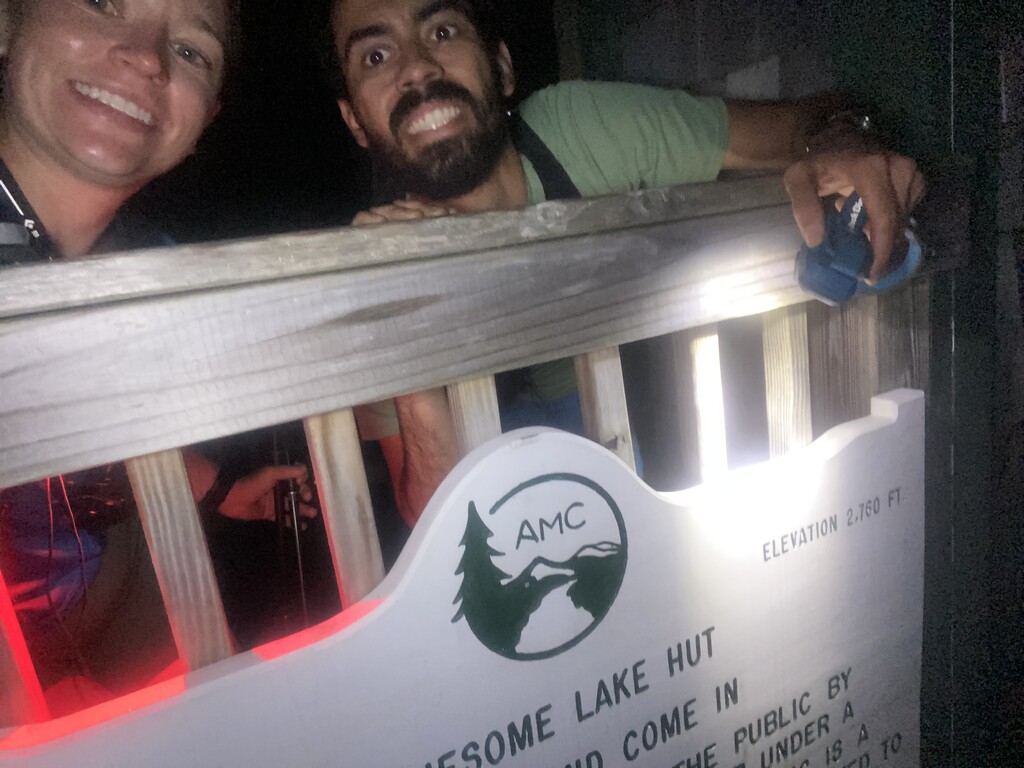 Greenleaf Hut (01:13): here was the shortest stop of the day. Snap a picture by the sign, eat a snack, pee in the bushes, and contemplate life for 23 seconds. Then we charge onwards into the trees. I’ve gone down this section of Franconia notch loop so many times, often at a jogging pace. This time however was reminiscent of, but still somehow slightly faster than, my first time akin to a death march in the woods. When we start encountering stone steps I am so sure we were close to Lafayette campground. Having been burned before, Liza wasn’t so sure. As usual, Liza was right 😓 and the trail continued snaking along until, eventually, we could hear water. Then it kept going for a while after that, and we could hear some cars on the road. Then, finally, it kept going for another long while and finally the bridge towards Falling Waters appeared. We were within spitting distance of the road! After a very confident wrong turn left towards the bathrooms, we make it out onto Lafayette Place. Briefly wander around looking for the tunnel and cross i93 to where we find Rami who’s just woken up from his nap in the car! We are just under 2 miles from the final hut. Cannot get too comfortable and so we press on through Lafayette campground, a maze of parallel streets, to find the final trailhead of the day: Lonesome Lake trail. A gentle trail for about half a mile before becoming a steep mess of massive boulders and roots. Just what we were looking forward to after 45 odd miles 🥰 I did not remember these two eternal switchbacks from last time. I hallucinated a sign pointing to the hut at least 20 times. Eventually, we make it to the lake and are able to speed through the final flat section to the familiar sets of stairs up to the last little bit of rocks — of course there had to be a fucking steep set of rocks right in front of the hut.