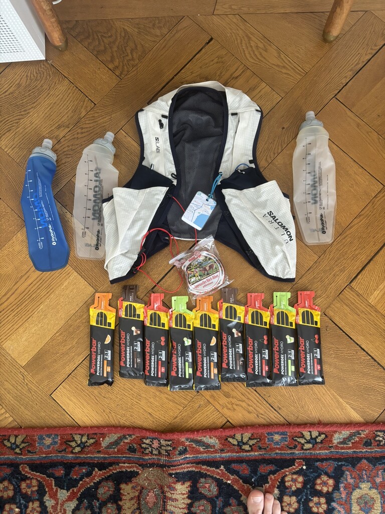 - Nutrition & hydration: started with 500 mL flask of water and 500 mL flask of sports drink, 9 Powerbar gels (67 mL, 23 g carbs), and a Bärli cookie (47 g carbs, 31 g fat, 8.1 g protein)