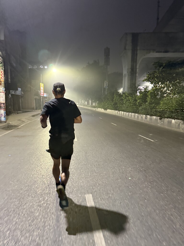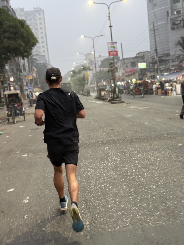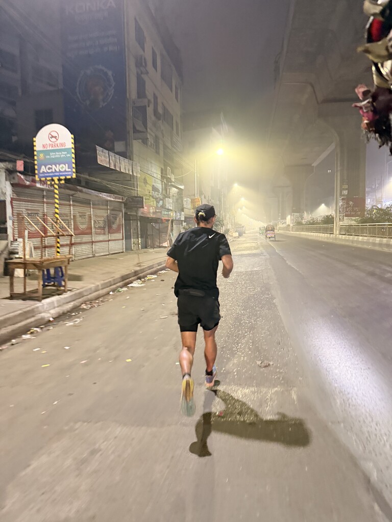 Today I ran north to south across Dhaka, one of the most densely populated cities in the world. I started just before sunrise at the National Cricket Stadium in Mirpur-10, beneath the newly opened Dhaka Metro trying to get ahead of the waves of cars, buses, rickshaws, CNGs, and people that fill the streets each day.