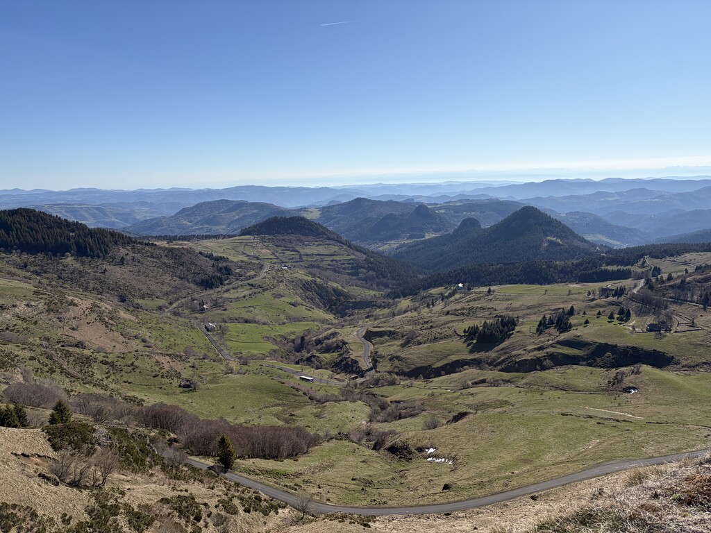 La montée jusqu'à la Croix de Peccata s'effectue entre la route, une jolie piste forestière, et les pistes de ski de fond, encore largement couvertes de neige dure et glacée. Je continuerai à courir dans la neige jusqu'à la Croix de Boutières. La descente jusqu'à la Chartreuse de Bonnefoy, puis la remontée jusqu'au mont Gerbier de Jonc, s'effectuent sans encombres. Je retrouve mon assistance (ma femme et mon fils) et me ravitaille après un petit aller-retour aux mires situées sous le Gerbier (Ferme de Flotte).