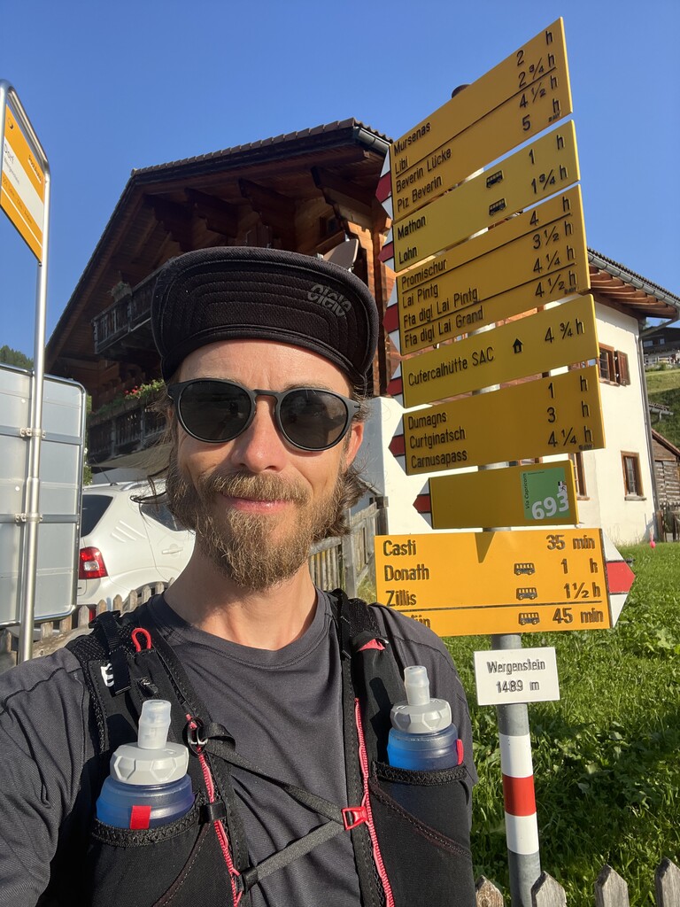 I started at 07:40 am in Wergenstein and ran the Via Capricorn in a clockwise direction, climbing first towards Farcletta digl Lai Grand. The downhill from the Alperschälli to Z’Hinderst is quick but punchy. From there, I followed the singletrack down the valley before climbing up to the Camaner Hüttä, staying true to the official SwitzerlandMobility route (Trail 693) which offers a smoother and more enjoyable experience on gravel and trail compared to the paved road below.