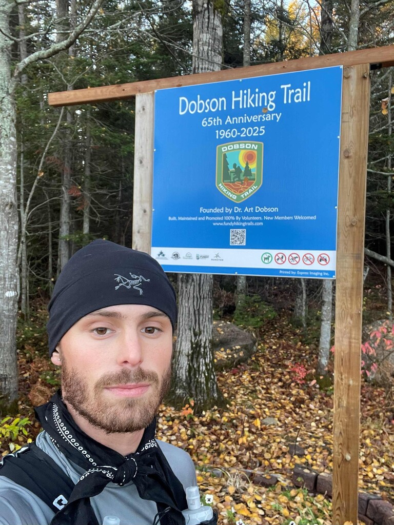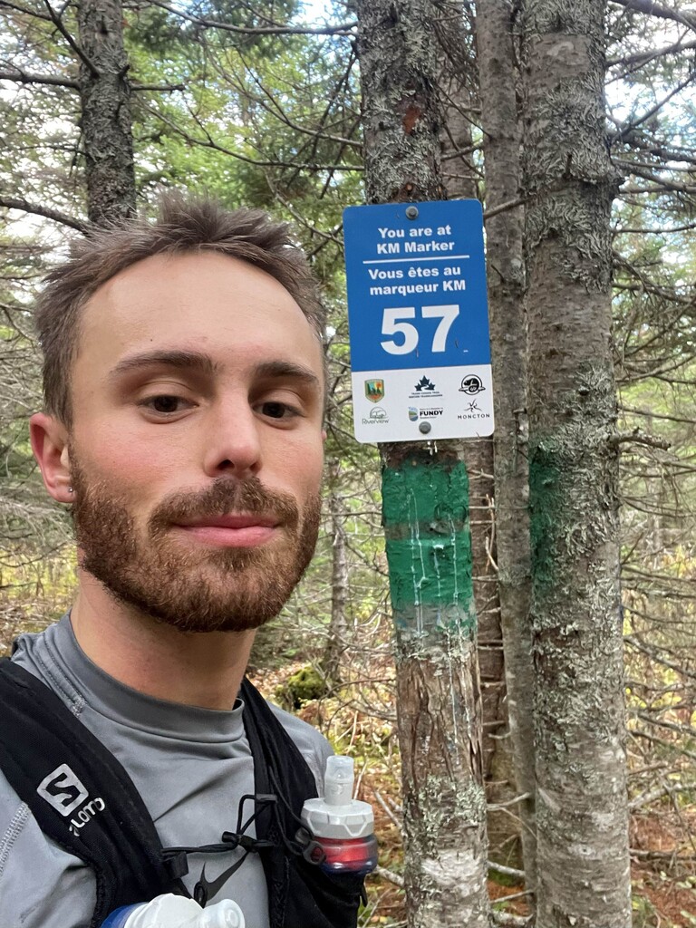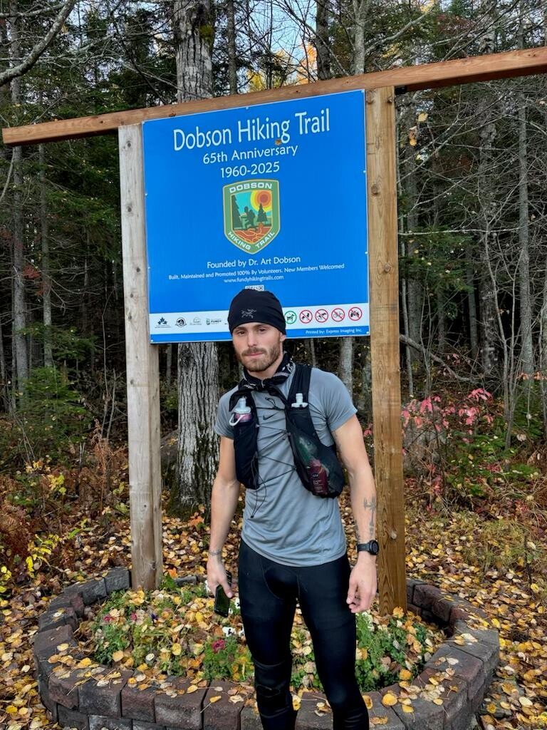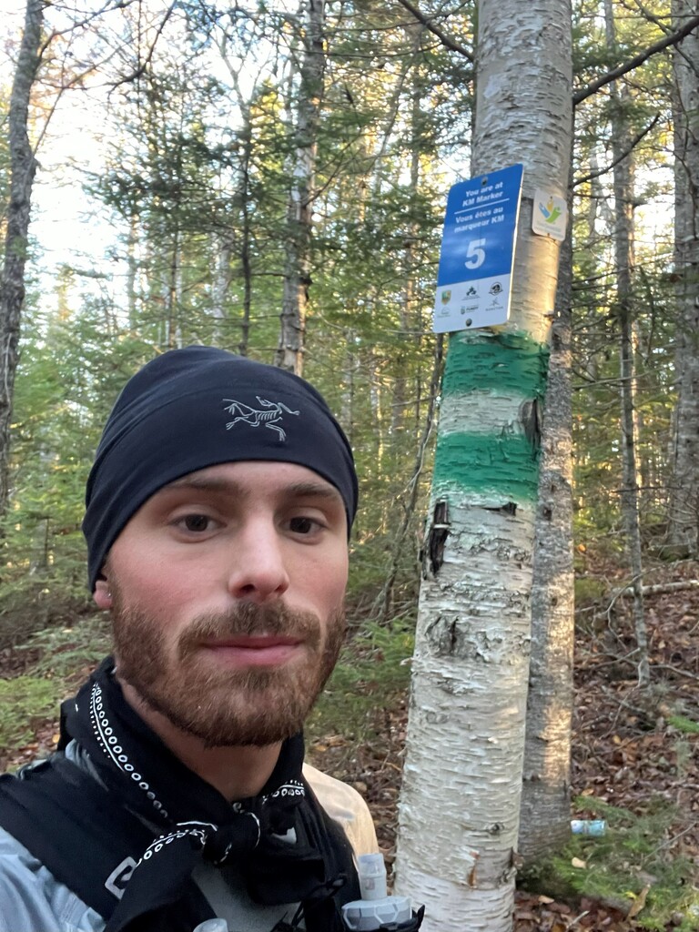 I set out from the official start near Riverview, New Brunswick at 8:27am October, 24th 2025 and arrived at the finish with a total elapsed time of 7hours 38minutes and 15seconds. The morning dew made the terrain very slippery. I filled up my Salomon flasks at several brooks along the way and brought 8protein bars and 6gels. The route was recorded on my Garmin watch. At a different time of year I think this trail would be more enjoyable but it was very fun to run the trail and set the Unsupported Fastest Known Time on the year of the 65th anniversary of this trail.