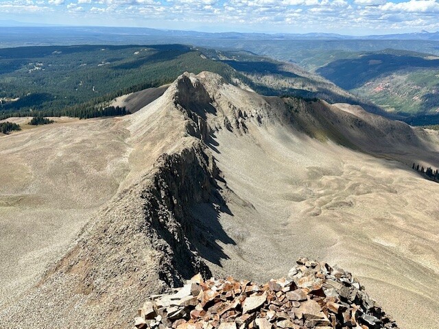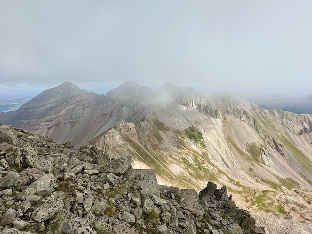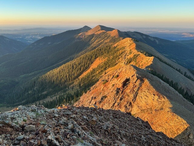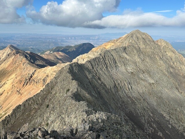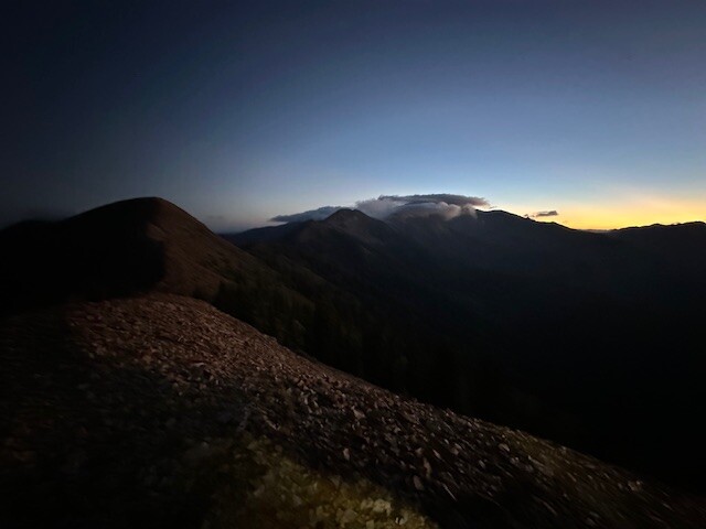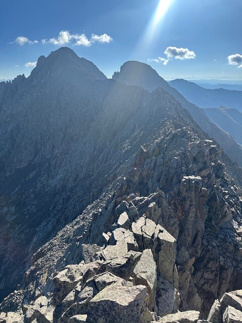 Summiting Middle Babcock from the west is sketchy AF. Every rock in the steep pinner I climbed was ready to sail. Extreme care warranted. Hesperus dinner plate choss is endless ankle torture. But Sharkstooth takes the cake for most dangerous choss pile. I set off several big rock slides ascending and descending it. Nothing is stable. I made one major navigational error between Efendi and Indian Trail. Got cliffed out atop a large gendarme, doubled back and had to bypass to the east. Lewis's north ridge catwalk is incredible. It's long with knife edges in places but it's all passable without any serious climbing or deviating from the ridge proper. Maybe the most solid rock in the LPs? Spooky exposure in the dark. Managed to rip my finger open while descending its scree on the south. Scree and darkness don’t mix.