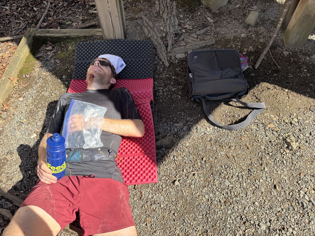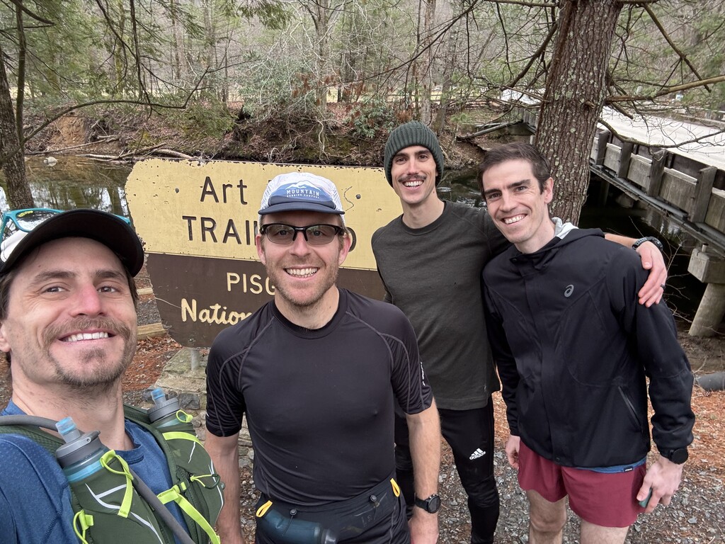 It was perfect conditions for an attempt. High 40s/low 50s in the morning at the start at 9 AM. Me and Will started together, he went with me for the first seven or so miles. Good thing he was there cause I almost took two wrong turns. He did a good job of trying to rein me in and not let me destroy myself too much in the first bit, as I was very excited and probably pushing a little bit too hard. We had hedges splits and were putting some time in on him throughout this whole first climb. After Will turned, I kept going to Gloucester gap, Justin cheered me on and ran with me for a little bit somewhere in there, and then I picked up Boone for the pilot Mountain climb. It felt like I was crawling up this and it definitely hurt me, but it turns out I was actually pushing it pretty hard and gained a bunch of time. Not a lot of excitement to report between the top of pilot and the parkway, except for the fact that Reese picked me up somewhere along the way there and was a great encourager while I was suffering. Generally felt nauseous and a little overheated more or less from the bottom of pilot until we started going downhill before the Narrows I was still trying to push tailwind and some gels as much as I could keep down during that time. Eventually, Reese handed me off to Canyon, who guided me down the last, and in my opinion, the worst part of the whole thing. At some point right before that I had rolled my ankle and it was hurting pretty bad at different parts of this descent. Canyon did a great job encouraging me in saying we are still very ahead of pace after we got through the narrows and then when we got to the technical but intermittently runnable single track, I started feeling better, the ankle kind of went away, and we started rolling. I was getting excited as we were getting closer and was trying to gain as much time as possible. That turned out to be a mistake, I slipped on a rock and fell really hard, fracturing my left wrist and putting a decent gash in my chin with about 2 miles to go. Thankfully, it didn’t smash my head open. I laid there for a little bit and was trying to make sure I was OK, and then after a quick triage saw an obvious left distal radius deformity, but figured I gotta get out of here somehow and I might as well keep rolling and try to get the time. I did take it very easy and just tried to make it out efficiently without falling for the last 2 miles, the wrist hurt pretty bad, but was still on some adrenaline ended up still getting the record by a little over eight minutes! Of course, it should be noted that David Hedges did this unsupported which I think is worth way more than eight minutes.