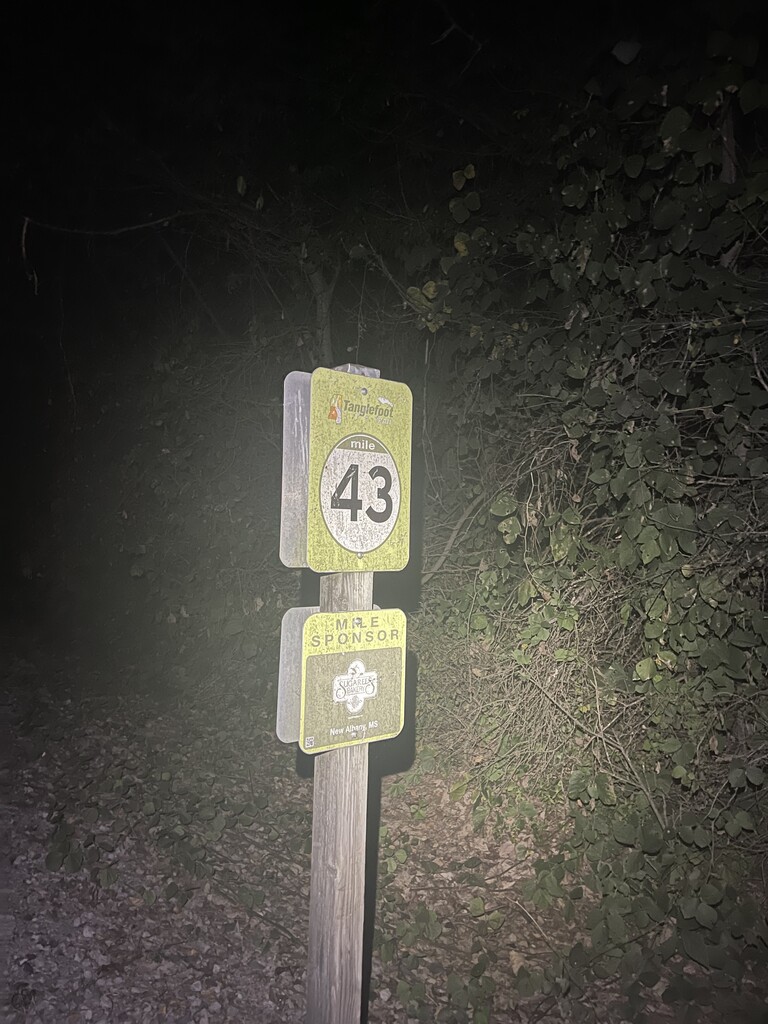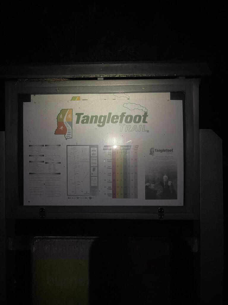 I finished the Tanglefoot Trail unsupported from start to finish. This was my first long distance run/hike and first distance for 50K or longer. I felt very tired towards the end but I made it to the end. The trail was well maintained but the weather was hot. I was alone for the entire duration. I carried all of my food/gear from start to finish. I got water from the public water sources provided at public parks alongside the trail intended for users of the trail. Water sources were spread out roughly every 10 miles. I followed the trail northbound starting in Houston, MS and finishing in New Albany, MS.