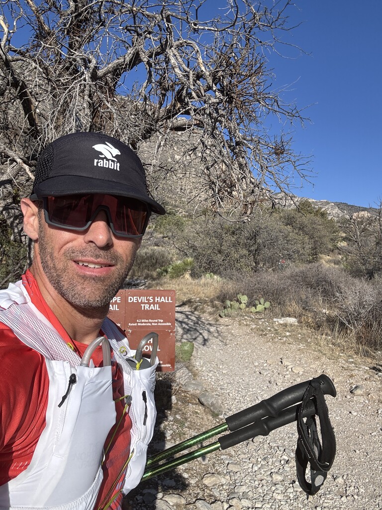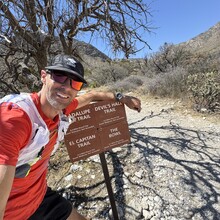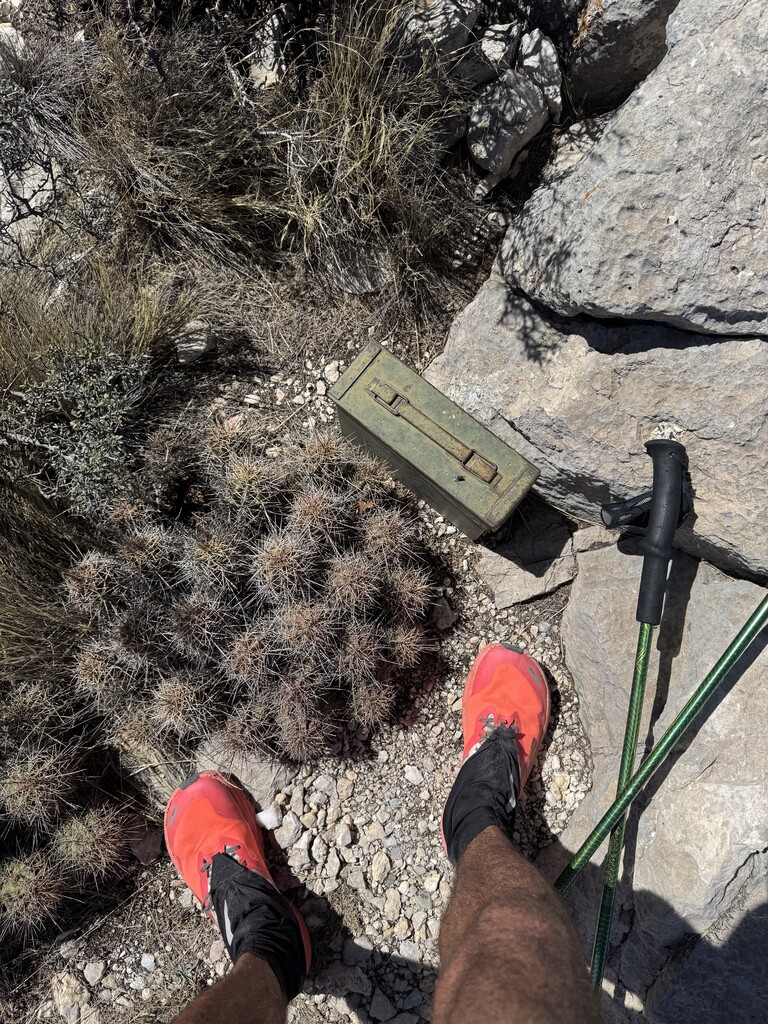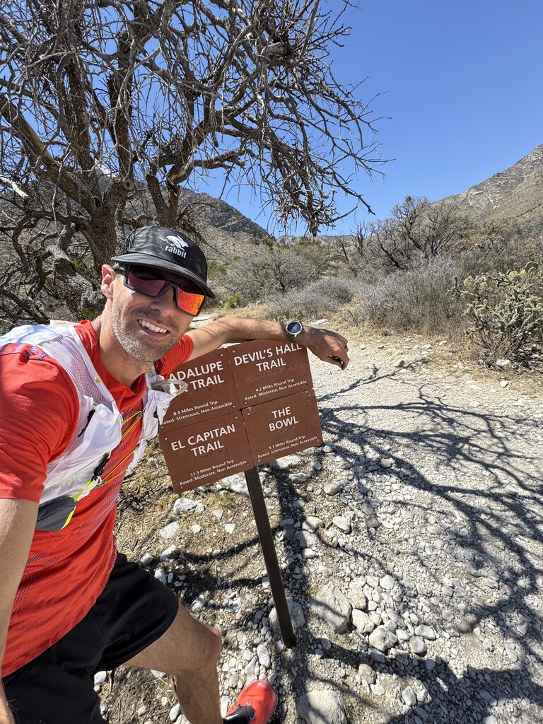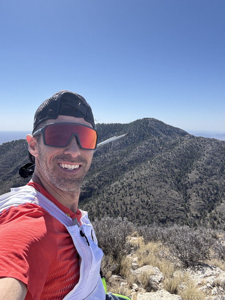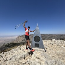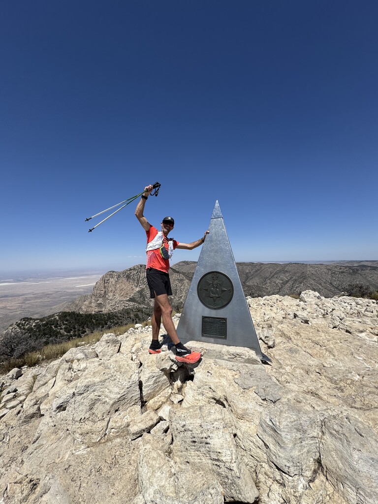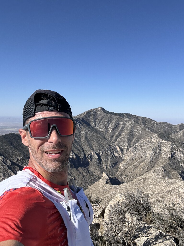 Started right after 8:20 AM (Guadalupe is in MT, but devices/uploads get confused with CT) and headed up Bear Canyon to Hunter Peak, which is not part of the four highest (6th highest peak in Texas) but is not much of an add-on so why not? Was 53m25s to the summit then 44m42s to Bush Peak where the off-trail connection to the other summits begins. Lots of steep and very rough terrain, and everything wants to slice and dice you, legs were torn up pretty good but I knew that going in and still only chose ankle gators with shorts. Only 24m07s over to Bartlett Peak then 27m38s to Shumard Peak. I was starting to struggle with the link over to Guadalupe Peak with some cramping, making it difficult to climb and step over brush, and covered this in 39m10s before getting back on the trail for the 4mi descent back to the trailhead in 39m50s for a total time of 5h05m55s and 1h21m43s off of the current FKT. It was hitting 80 degrees and barely any wind so that didn't help. I think the off-trail route I took was pretty efficient, there are definitely some spots along the ridge line you do not want to lose your footing. I chose the counter-clockwise direction to cover the Bear Canyon climb right away, I think this is a good safe direction even if you decide to go up Tejas instead, so if you do run into trouble late in the route you will be on/close to the very popular summit trail. I am in the park for SAR so please ensure you are well-equipped and don't let the FKT push you into a dangerous place. I could have carried more water and fuel, only 2 x 800ml, four isotonic gels, and bag of chews. I also started with a full belly of water. Some time to shave here in cooler conditions and not heading in as fatigued (had done the summit trail for SAR the day before). Incredible route, the ridge is impressive on the west side and was my favorite view. Wore the Altra Mont Blanc Carbon with the trail gators and used poles which were key for the bush wacking and steep terrain. Eyewear and headwear is another good choice to protect from branches.