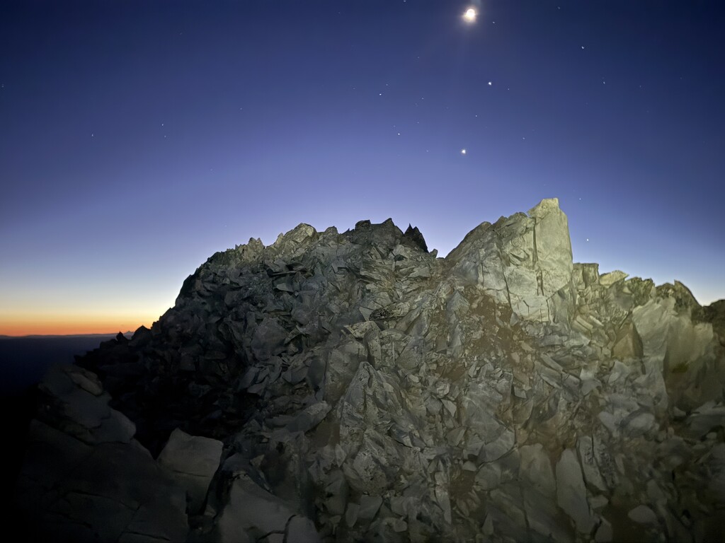 The lead-up wasn’t ideal: I’d been battling stomach issues (maybe got something from creek water?) for ten days prior and wasn’t sure if this attempt was going to happen. After two days of feeling normal, I woke early Tuesday morning, stoked and ready. The air was clear of wildfire smoke, my belly was calm, the forecast splitter. As Johnny Cash says (or maybe Mathias Gruber said it for the first time), “If the good Lord’s willing and the creek don’t rise,”–it's a go. Excitement charged me up Capitol and we were moving off the summit as the sun came up.