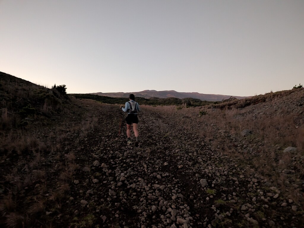 After a 3am wakeup and a 1.5 mile jog down the start of the route, we officially started our watches at 4:31am on Jan 18, 2026. Our friend and crew Todd was waiting for us when we got back up to the highway, after he generously drove 6 miles up the road and stashed water and calories for us. After quick goodbyes, we started questing up the steep paved road, pacing our climbing muscles for the task ahead. The first miles went by smoothly, no pigs or humans to be seen our heard. We stopped at our stashed goodies, the only aid we would receive for the route, and bid goodbye to the roads for a while.