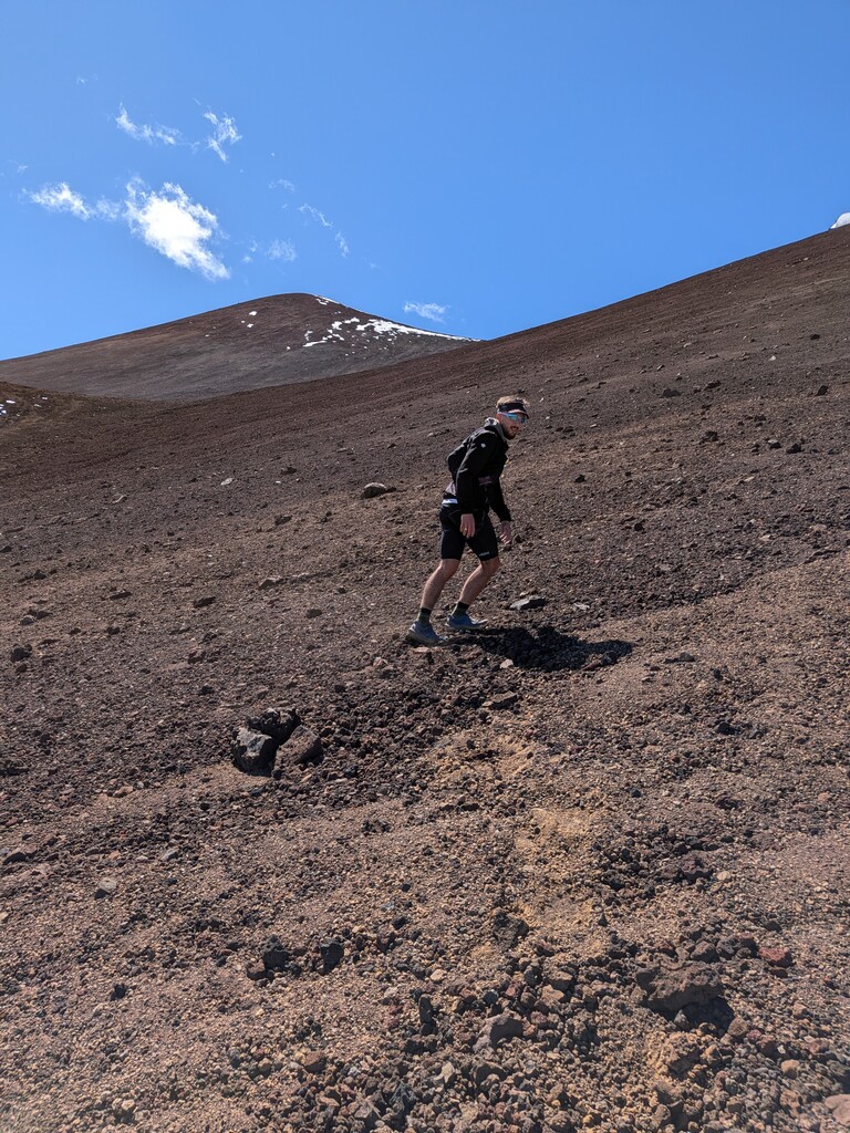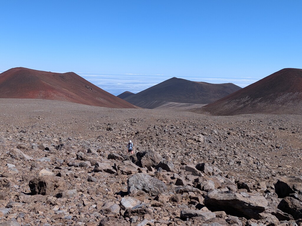 The next couple thousand feet were the slowest going. We followed the GPS track as a general guideline, but took more direct and faster lines where we felt they were appropriate. We slowly moved through the huge mounds of lava rock around us, over boulder fields and through the valleys they created. We deeply felt the lack of oxygen, and had to stop occasionally to let our veins stop throbbing. Eventually, we made our way through two large red lava cones and saw the summit with its telescopes, and were shocked at their scale.