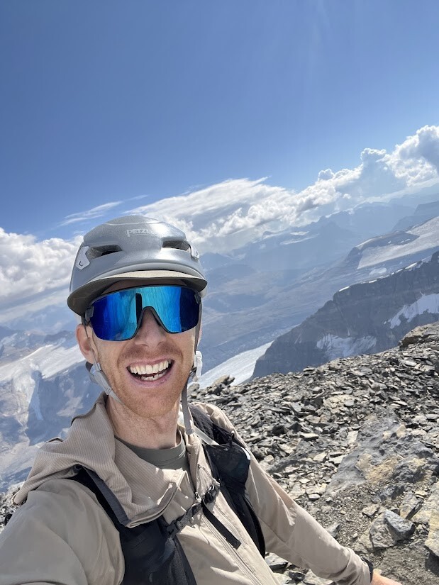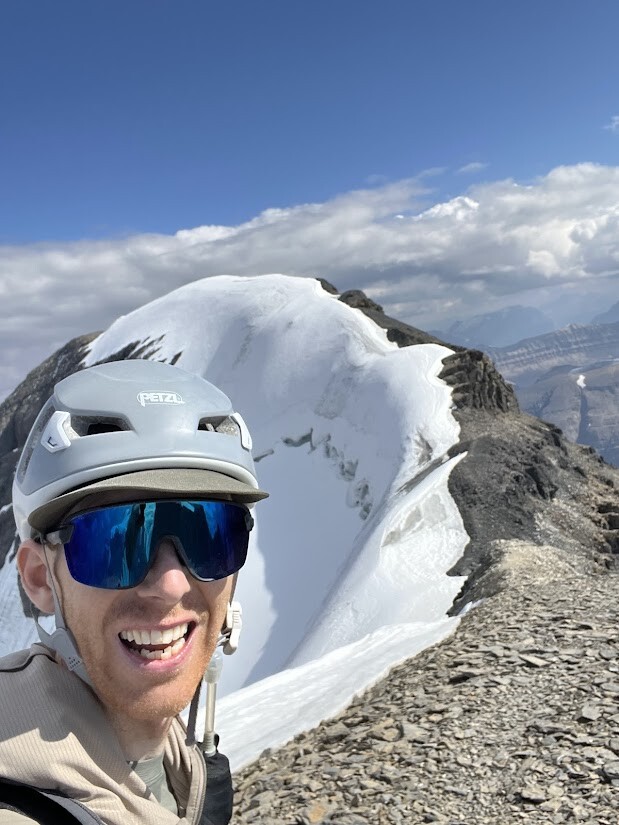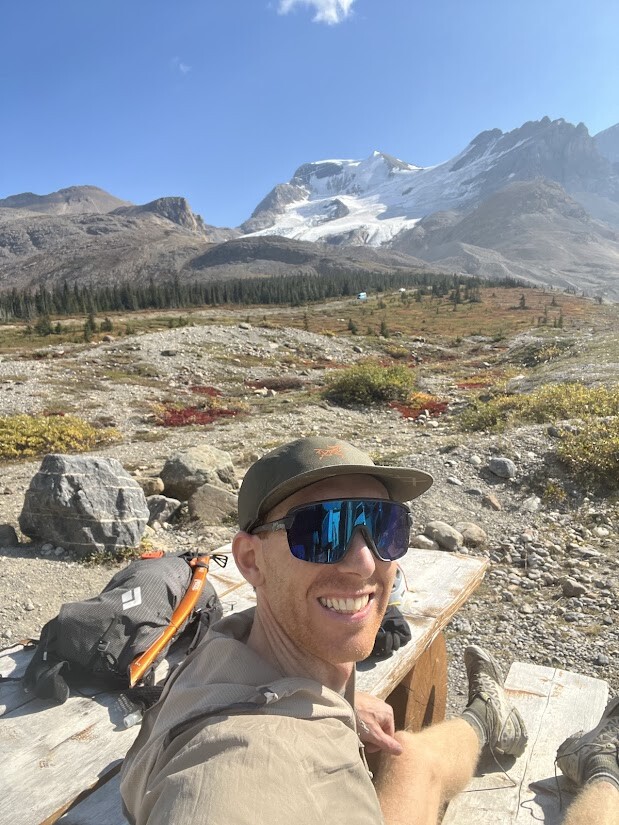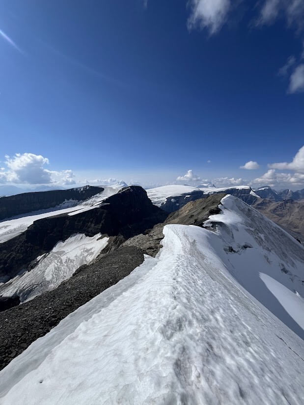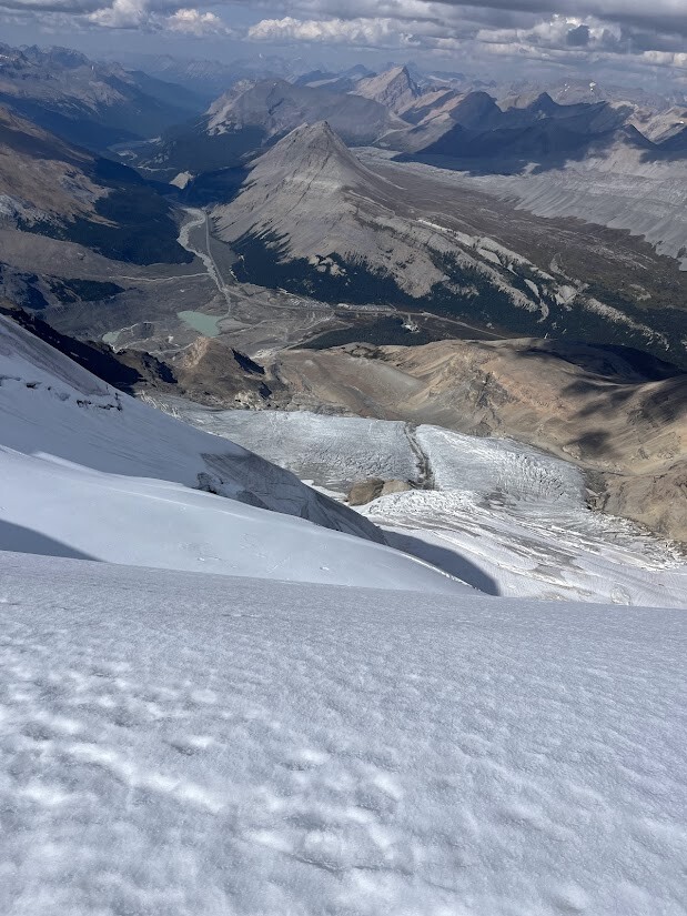 Having read some trip reports of the 'scramble route' being in good condition and a good forecast i took the chance on a late start, having had a haircut in canmore at 930am. From the car park weather looked great and temps were nice (especially for sept!) I pushed fairly hard on the up with the ambition of scouting the route to put in a fast effort some time in the future. I almost missed the turn off onto the moraine but once i got going there seems to be some fairly well worn trails through all the talus, route finding was simple until i hit the headwall, i accended one of the incredibly steep scree slopes pretty sure i was on track but it soon became steep and overly commiting and technical for what i was expecting, after a bit of searching and unpleasnt traversing i found myself in the correct gully that has a well worn scree chute and a small cairn was reassuring. Once that was done its an easy grind up the ridge, i put on microspikes for the last snow ridge but most of the snow is avoidable. I txt my partner to let her know id summited and checked the watch (about 2hr10 to car to summit) and realised i had plenty of time to decend so started a quick and easy decent sticking to the same accent gully on return, this made for fast travel but lots of rock moving and would not be ideal if anyone else was coming up. Lower glacier was bare ice and rock covered so no spikes required then a case of fast decent and retracing a quick line down the lower moraine and along the road past tourist buses!