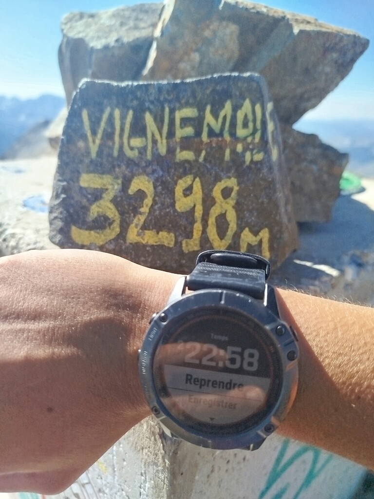 Départ du Barrage d'Ossoue vers 9h après 1km d'échauffement sur la piste 4x4. J'ai couru sur le plateau d'ossoue et tenté de relancer lorsque la pente était moins abrupte. Il n'y a que 600m de dénivelé sur les 4 premiers kilomètres jusqu'au grottes de Bellevue. Ensuite le chemin laisse place aux cailloux et la pente se durcit. J'ai fait en sorte de cheminer sur les dalles, en suivant les cairns, jusqu'au plus haut point possible. Une courte pause pour enfiler les crampons d'approche et le casque d'escalade au pied du glacier. Une traversée d'environ 15 minutes du glacier pour arriver au pied de la paroie finale. et 7 minutes d'escalade facile pour arriver au sommet.