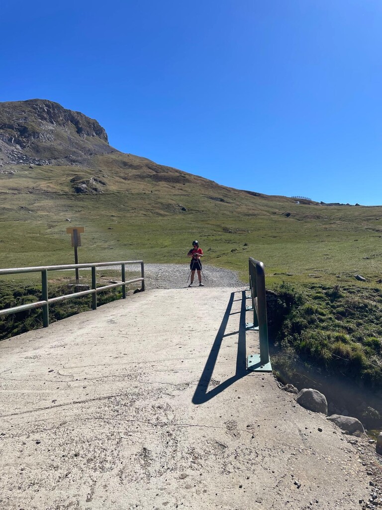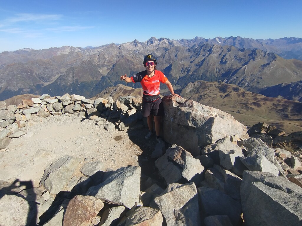 Le début du parcours est un chemin classique qui monte en lacet jusqu'au col de soum de pombie (26 minutes). Puis un beau chemin légèrement descendant jusqu'au refuge de pombie (33 minutes). Ensuite il faut traverser la raillère, un chaos de bloc puis reprendre un beau chemin jusqu'au col de Suzon. Au col le chemin se raidit jusqu'au pied de la première cheminée (1h05). Je suis ralenti par les cordées qui descendent en rappel mais je n'ai perdu qu'une ou deux minutes. Entre les cheminées le chemin est technique et très raide. Je croise encore une cordée dans la deuxième cheminée puis je suis seule dans la troisième. Le final de l'ascension, appelé "rein de pombie" est très technique et très raide, les cailloux roulent sous les pieds et il y a énormément de chemin possible. L'ascension se termine par un petit parcours de crête un peu aérien. J'atteint le sommet en 1h51. Un homme que j'ai doublé sur la crête me prend en photo et je repars immédiatement. La descente se fait exactement par le même chemin mais avec la fatigue parfois je fais des détours. J'arrive au bas des cheminées en 2h25. Puis au refuge en 2h45. Et au pont d'Anéou en 3h05min38s.