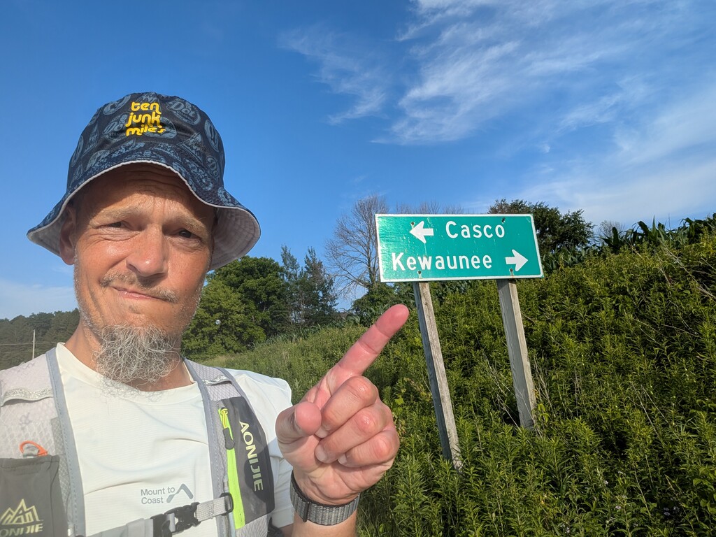 Day 5 began with deer. There are so many deer in Wisconsin! Every day I saw deer multiple times. Driving from the hotel back to my starting point for the day we narrowly avoided deer two more times in a 15 minute drive. I am a morning person. I was having trouble thermoregulating. I was cold as Day 5 began. To warm up I began running. I was able to make it 9 miles in two hours back to the hotel in Pulaski where I met Katie for the first time on the day. It was only about 6:30 am and I continued moving to bank time. I was able to complete the first 20 miles well before 11:00 am when things started getting really warm. I took a lot of time making many stops to get fountain soda through Howard and Green Bay. Katie took a break from crewing during that time and I ran self-supported for a few hours. From Green Bay I followed Humboldt Rd and Luxemburg Rd East toward the Lake. From Ryans Corner I followed Hwy C to Kewaunee. This section from Green Bay to Kewaunee was entirely unplanned and unresearched. Without Katie crewing it is not possible for me to follow that route as there are so few resources along the route. It is exposed rural country roads. I did enjoy my final stop at the Ryan Country Park and Sports Complex. The last 20 miles was grueling. I knew I could get to the end, but I was experiencing pain in hips, knees, ankles, feet, and toes. Every joint in the lower half of my body was swollen, sore, and inflamed. These miles continued to be mostly hiking and all with grimace. My phone battery was failing and my phone would not charge. So I had to live in my own mind and body at a time when I wanted more than anything to escape. The only option was to crawl into my own personal pain cave. The pain never went away until the end. However, I was able to pick up the pace the final 5 miles and run most of it quickly. I ran straight into the Lake and enjoyed life as the cool water calmed my feet and knees for the first time in days.