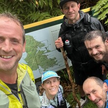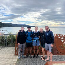 Through broken communication we had managed to get Adam’s tracker working and could follow their progress, we estimated they would be arriving at the trail head not too long before our scheduled ferry departure on Sunday afternoon. After being delivered back to the accommodation by Jack we had a well-deserved beer then hot showers and literally crashed at about 1.30am. After a few hours of the usual uncomfortable and fitful sleep we woke up to see Adam and Julia had been making good time and should finish around lunchtime. We headed down to The Snuggery for a breakfast snack and coffee, from here we arranged to meet Jack for breakfast at the South Seas Hotel. A huge Big Breakfast with pint of coke was had by all as we started to wonder how we would collect Adam and Julia at the finish. A failed attempt at organising a taxi for they were busy and Jack not being able to borrow another vehicle threw a spanner in the works. Not to be beaten, Chris ducked out of the pub to the E-Bike hire shop across the road, he returned triumphant with 5 bikes hired with two arranged to be dropped off at the trailhead. Jack secured staff rates and joined us for a cruise around Oban and then out to the finish to wait for the arrival of Adam and Julia. They arrived looking better than how we did with awesome stories of beautiful sleeps, Jurassic Park valleys and huts full of food - something Steve, Isaac and Chris had literally no idea about at all.
