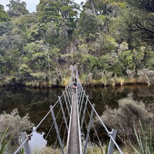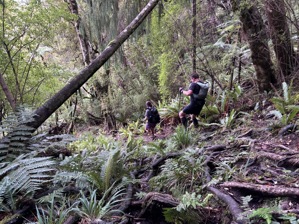 As soon as we passed West Arm Hut and left the Rakiura Track you notice the difference in quality between a ‘Great Walk’ track and the less used North West Circuit. We were pumped to get into the more technical tracks of the North West Circuit, not sure we were thinking the same later on. We reached the summit on this section at 6.57pm. This was a really cool climb, nice, steep and tight with heaps to hold onto then opens up towards the top. At this stage we were in the clouds but we imagined some good views across the tops would have been had, we did get a couple of windows whilst descending to see the swampy plains below.