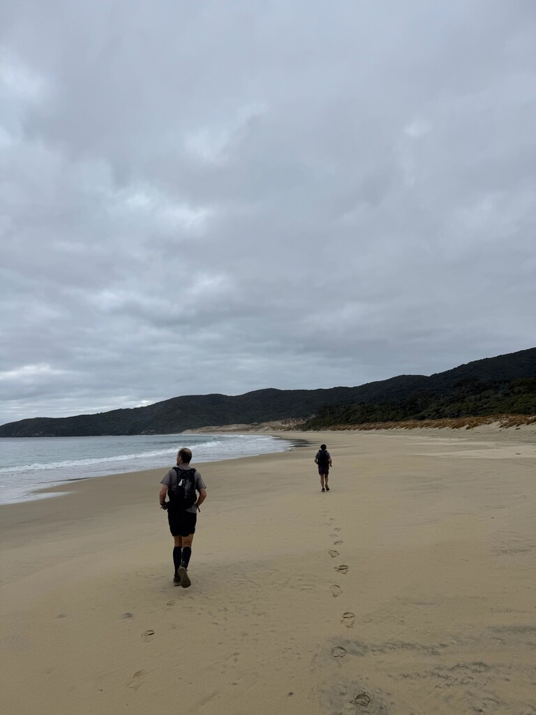 We left East Ruggedy Hut in the daylight and this gave us a massive boost. We were moving well until we hit the three creek gullies feeding into Long Harry Bay. If you let them these will break your soul, gain a heap of elevation only to lose it again, then repeat two more times. We met our first trampers on the track at this point, stopped for a quick exchange of plans and carried on. During our highs on this section we started to calculate how we were tracking, for we had been extremely slow at times and this concerned us. Maths is never easy to work out when sleep deprived but thankfully Steve took control and worked out that if we can achieve 3kms an hour we will make it in time to finish under 35 hours. From this point forward we would call out the pace as each KM passed and would celebrate any KM under 20 minutes!