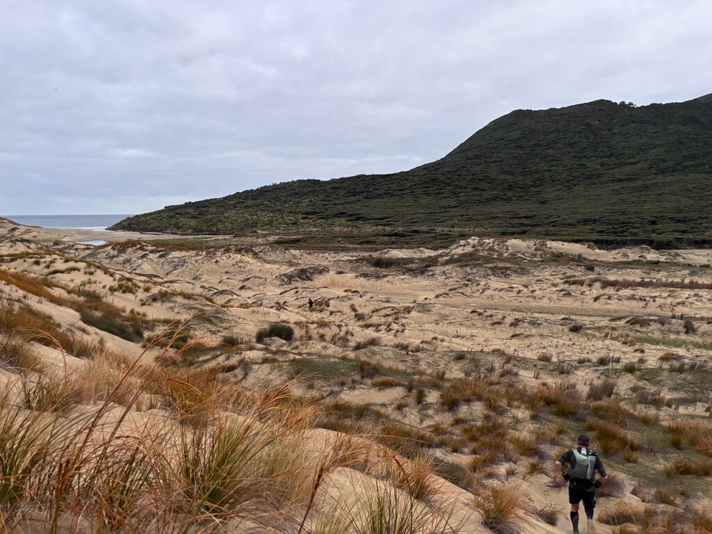 Things were getting rough for all of us by now and the Trip Log Notes became stripped down to the bare essentials. Funny how often, when most needed, nature provides and it sure did provide with the most amazing double Kiwi encounter, it was truly special. It was on this section we started to get some phone reception and we checked in to see how Adam and Julia were getting on. However, their trackers we not operating properly and there had been no communications from them, so we sent a message in hope they would get this when they got into reception. The climb off Smoky beach through the Sand Dunes is quite the spectacle and was led by Isaac after testing his limits with a 7 minute KM on the beach followed by Steve, and by the time we got off the sand dunes Chris had finally caught up after his fast(slow) walk of the beach.