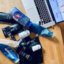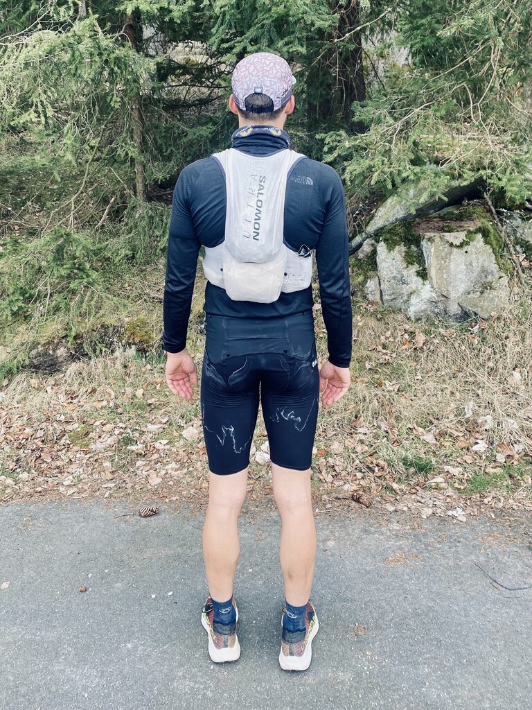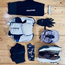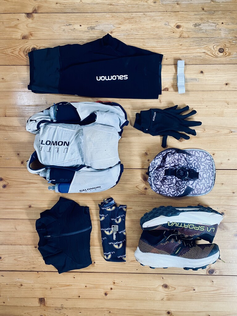 Garmin Fenix 6Pro, La Sportiva Prodigio Pro, cap, buff, gloves, running tights, long sleeve, rain jacket, safety blanket, Salomon S/Lab 10L Pack, iPhone 11