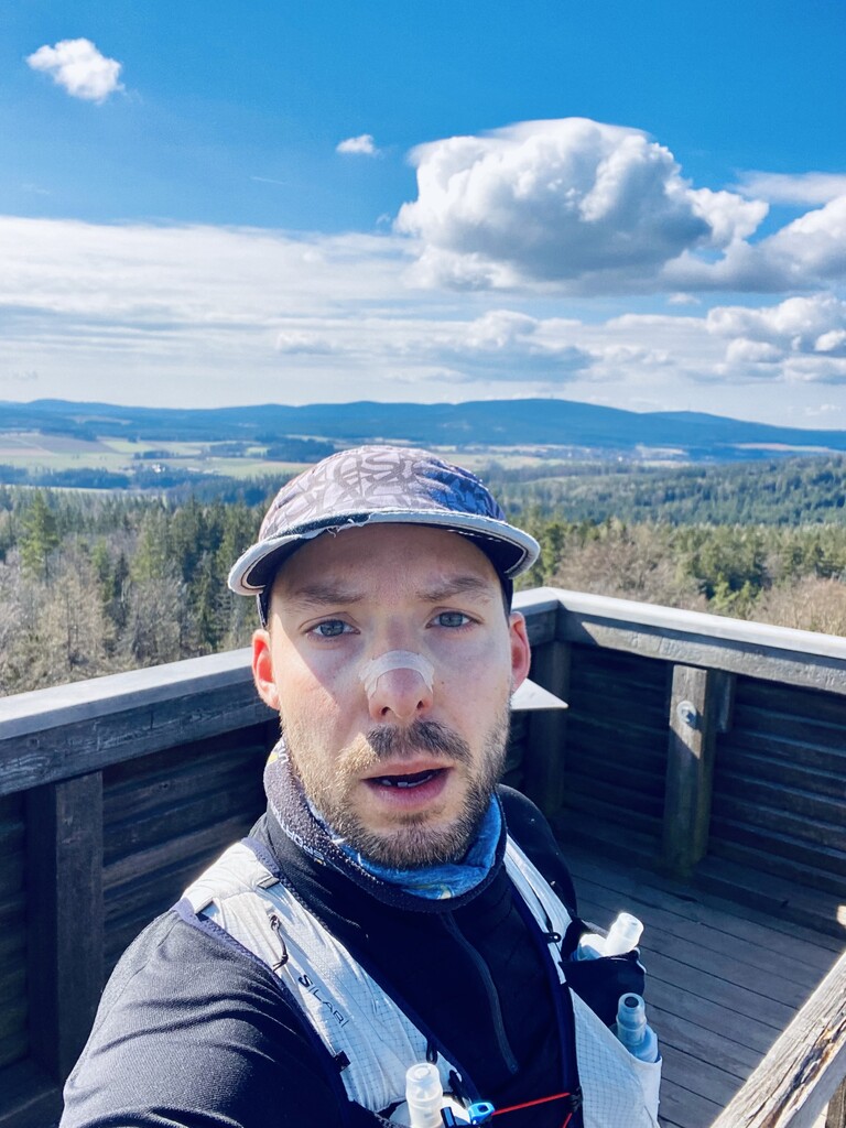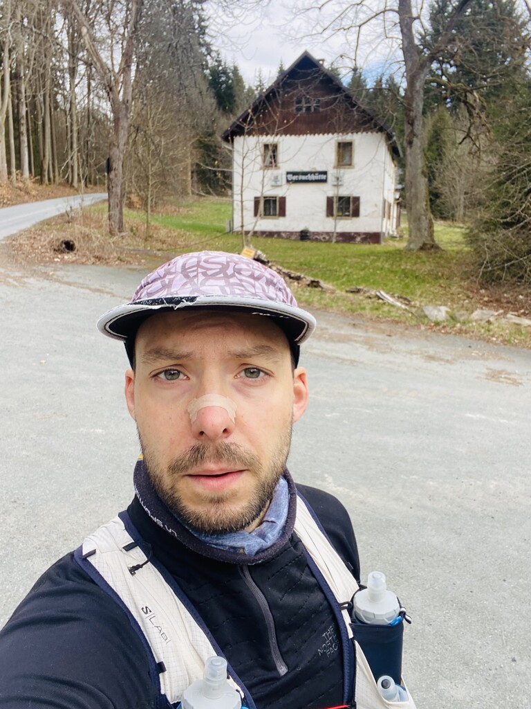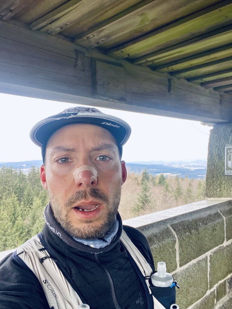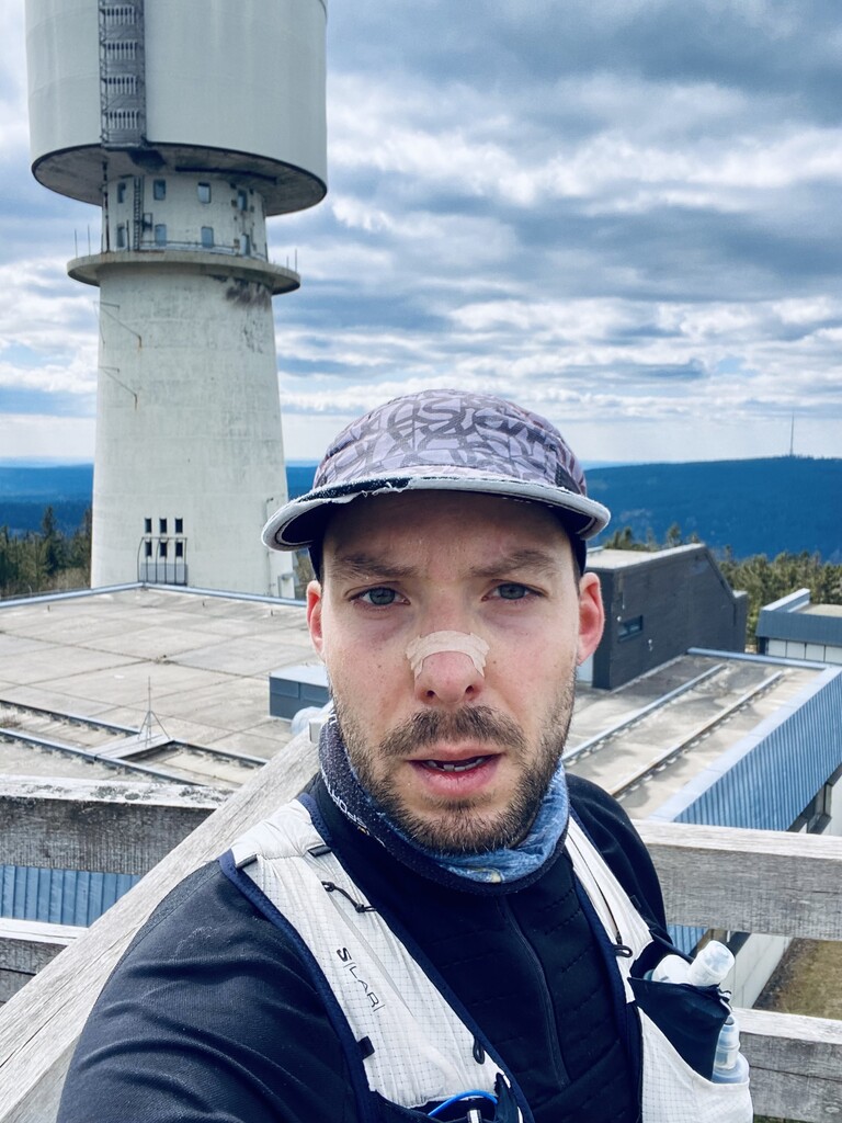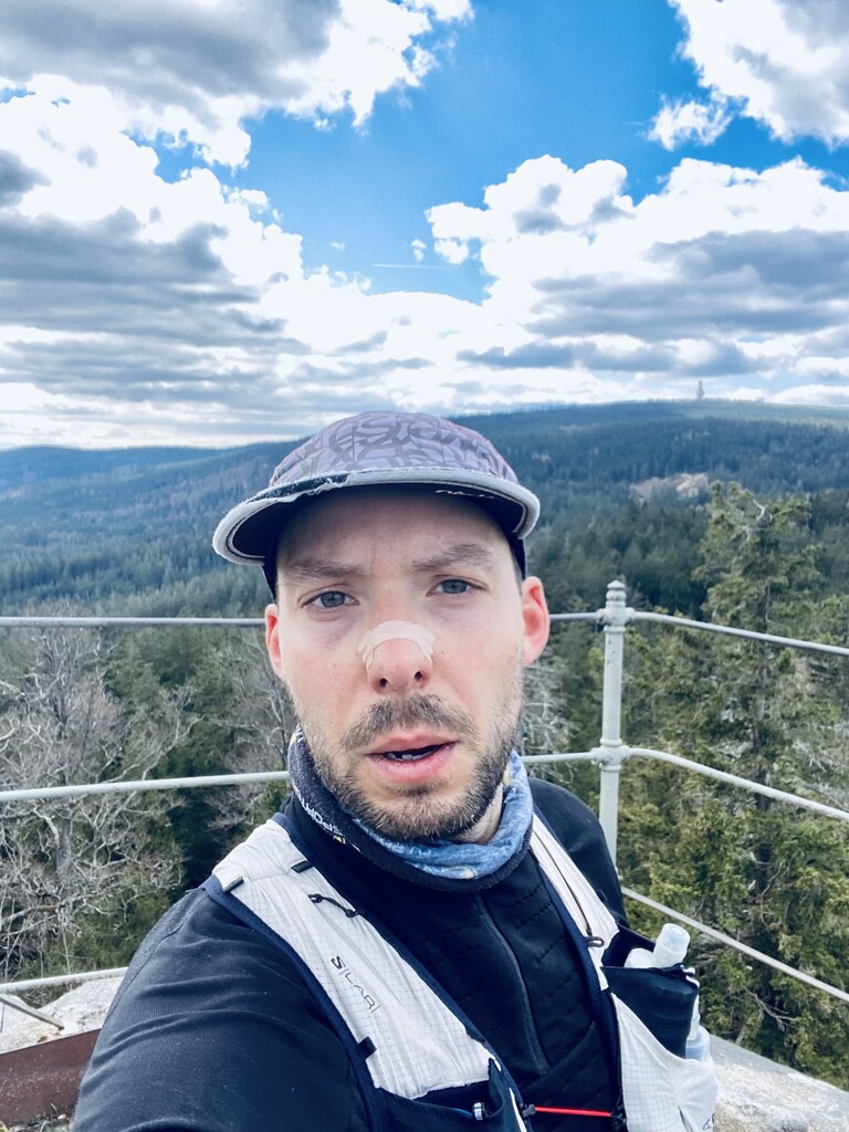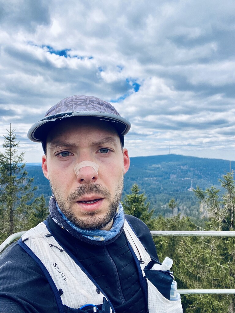 Auto bei der Alten Vorsuchhütte geparkt kurzes warm up und um 10:00 Uhr losgelaufen, auf dem Weg zur Piste hoch sehr schwere Beine, fühlt sich nicht gut an, um 10:09 Uhr oben auf der Schönburgwarte (Kornberg) angekommen, beim Downhill leichte Krämpfe in beiden inneren Oberschenkel-Muskeln, Zweifel machen sich breit ob das heute was wird, im flachen Stück Richtung Kirchenlamitz immer noch sehr schwere Beine, Krämpfe lindern sich, um 10:59 Uhr oben auf der Aussichtsplattform am Epprechtstein, Teil des Verschlusses am zip Beutel fürs Handy reist ab, von hier an immer ein ziemliches Gefummel das Handy aus der Tüte zu bekommen, die zügig weiter Richtung Waldstein, Krämpfe fast weg, kurzer Stop um Flaschen zu wechseln beim Aufstieg + kurze Pinkelpause, oben auf der Schüssel (Waldstein) um 11:38 Uhr, Sonne kommt raus, kurz zeitig sogar etwas warm, zügiger downhill Richtung Weißenstadt, oben am Aussichtspunkt Rudolfstein um 12:24 Uhr, auf dem Backöfele (Schneeberg) um 12:46 Uhr, weiter Richtung Nußhardt, um 12:57 Uhr ist der Gipfel erreicht. Schneller downhill nach Karches, Stopp am Brunnen um Flaschen aufzufüllen, es wird bewölkter und kühler, Handschuhe raus, Pinkelpause beim Anstieg, um 13:38 Uhr oben am Asenturm (Ochsenkopf), spüre langsam meine Beine, die Platte um 14:25 Uhr erklommen, schneller downhill bis zum Silberhaus Parkplatz, Anstieg zur Hohen Matze zieht sich, kurze Pinkelpause, am Gipfelkreuz 14:56 Uhr, Kopf beginner zu scherzen, wahrscheinlich zu wenig Wasser, trotzdem zügiger Anstieg da mir langsam die Zeit ausgeht, oben am Kösseine Turm um 15:26 Uhr, erstes Stück vom Weg recht unwegsam auf Grund umgefallener Bäumen, werde langsamer, Großer Haberstein um 15:41 Uhr, 15:47 Uhr am Burgstein Felsen, downhill Sprint auf Forststraße, 15:55 Uhr am Denkmal an der Luisenburg.