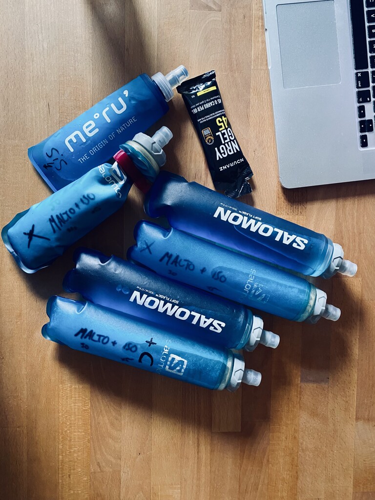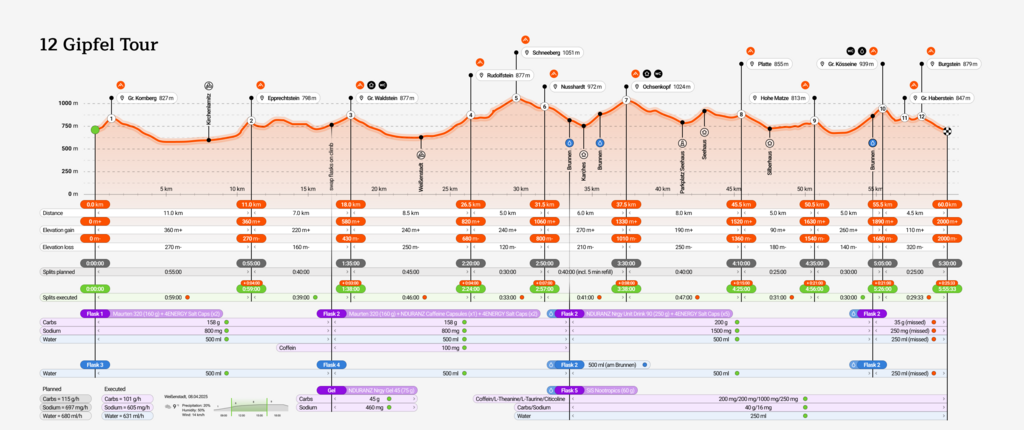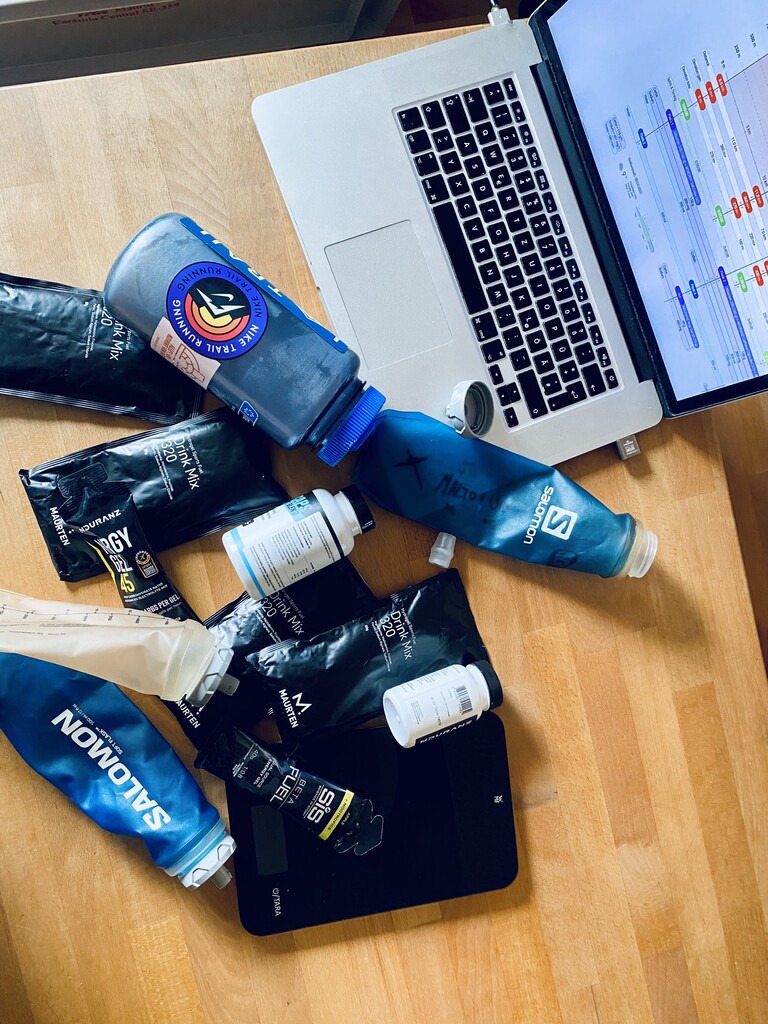 3735 ml Water, 1x NDURANZ Nrgy Gel 45, 1x SiS Nootropics Gel, 320g Maurten 320 Drink Mix, 250g NDURANZ Nrgy Unit 90 Drink Mix, 9x 4ENERGY Salt Caps, 1x NDURANZ Caffein Caps (Total: 598g Carbs [101 g/h] 3581mg Sodium [605mg/h])