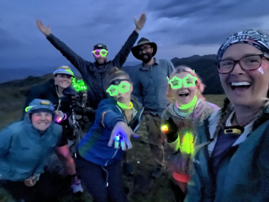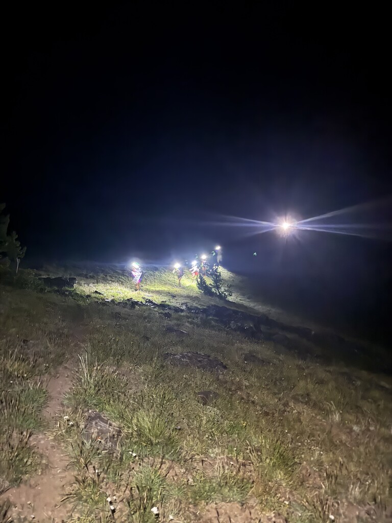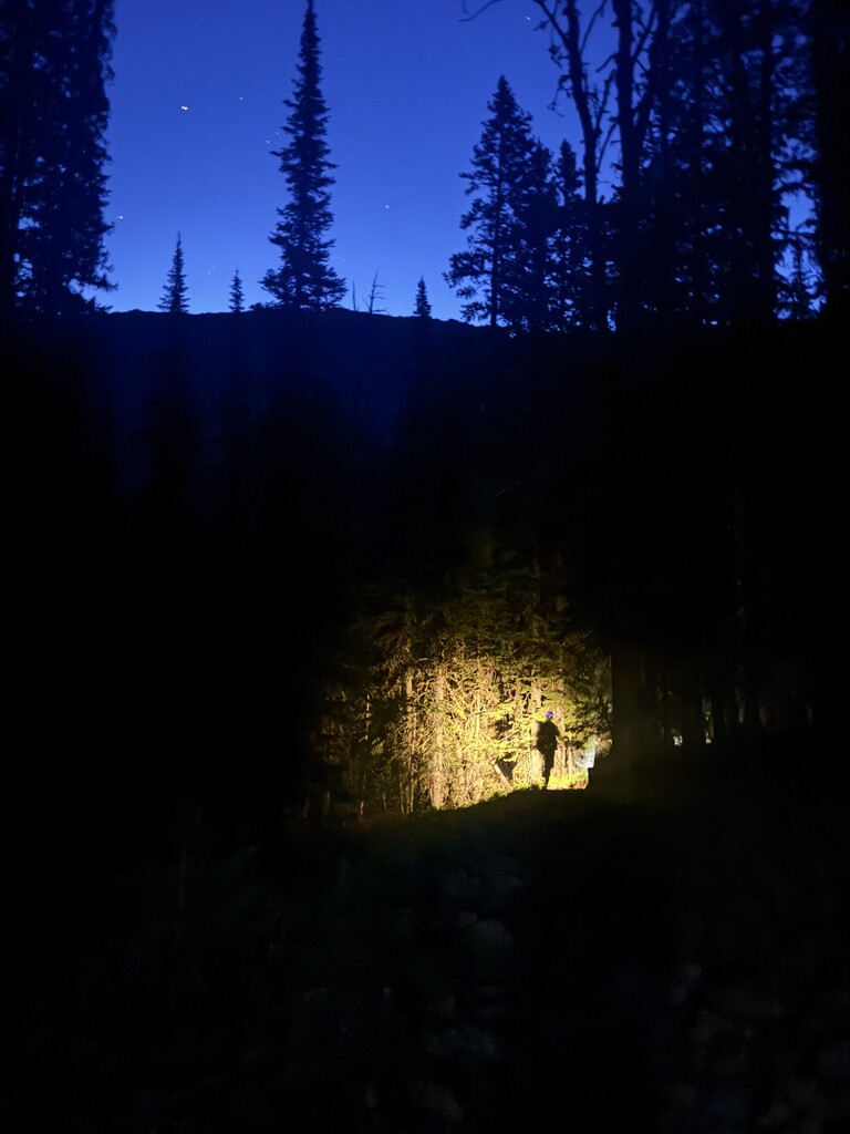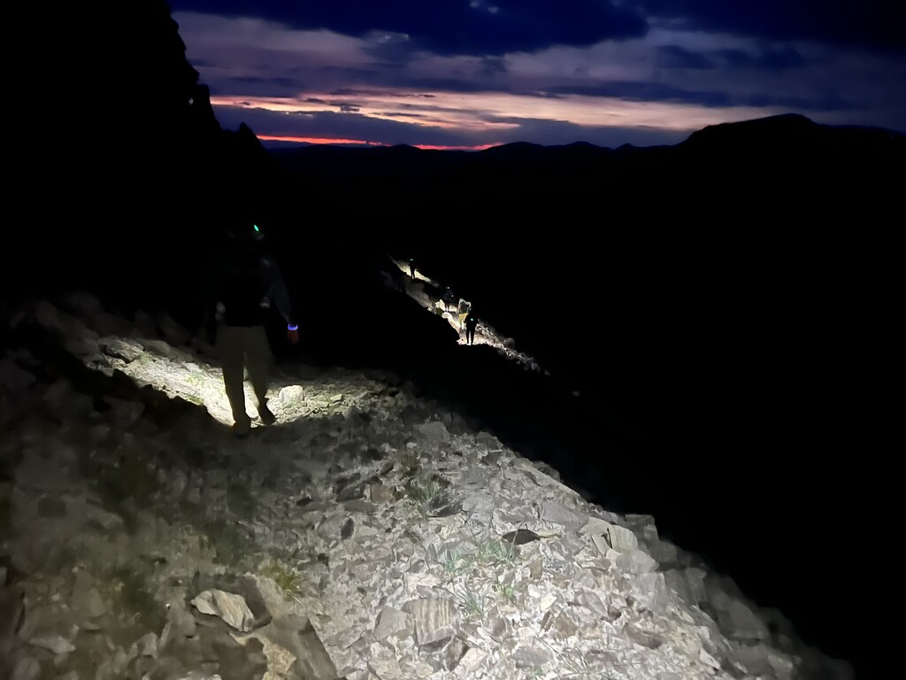 By 9:15pm we stopped to crack glow sticks & prep for night hiking. The trail turned from mostly dirt to mostly rock and navigating the talus fields in the dark was intimidating & exhausting but also exciting. At 2:40am we got to Hyalite Peak and began the slow decent navigating a couple more tricky snow crossings.