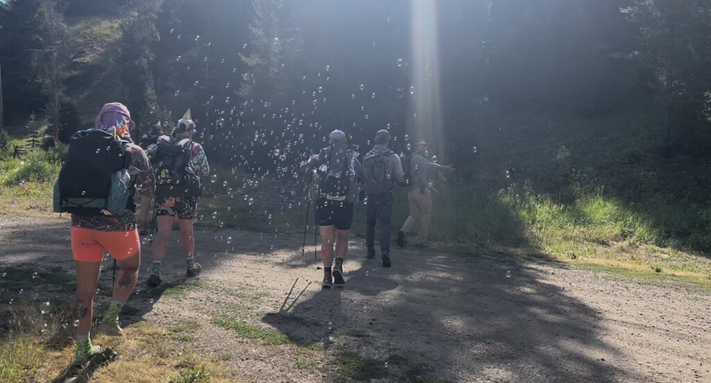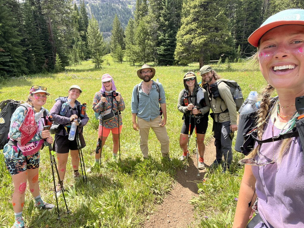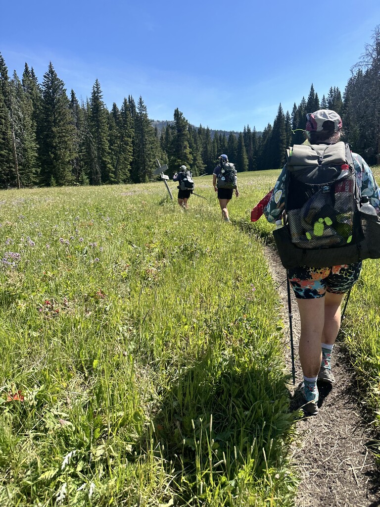 Packing out a whole pizza each, entirely too much body paint and endless enthusiasm- we started from Buffalo Horn Trailhead at 10:00am on July 26, 2025. The climb up was gorgeous, gently graded & lush, though the trail was deeply rutted by dirt bikes which we saw many of. We stopped for water at Ramshorn Lake around 12:30. Fortress mountain was especially unique and once on the ridge we were greeted by gorgeous views of the surrounding mountains.