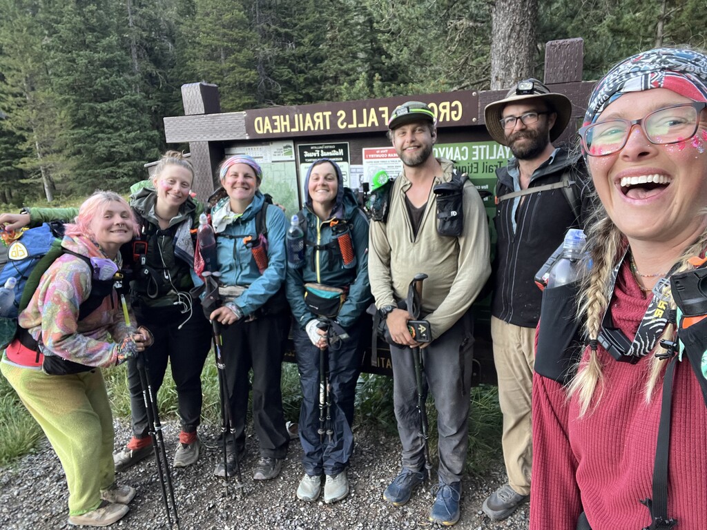 We again collected water flowing over the trail just past Hyalite Lake, although there were abundant water crossings & water falls all the way down to the parking lot. The final miles seemed to stretch on forever. At 7:02am we all reached the Grotto Falls trailhead making our time 21 hours, 02 minutes and 17 seconds.