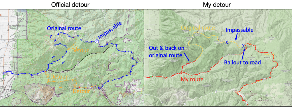 The included map shows an overlay of the original main route (yellow) and my own track (red). As one can see, the only significant deviation is the official Midnight trail #81 detour. The other deviations were so small that one can’t even see them on this overlay map.