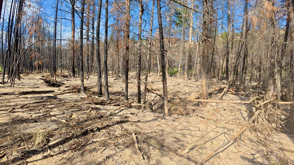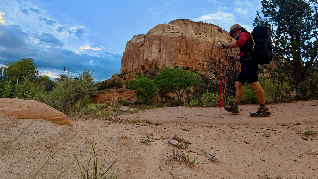 The descent to Ghost Ranch led through various canyons that showed clear evidence of recent severe flash flooding. Given the daily thunderstorms occurring throughout my journey, this made me somewhat nervous about potential water flow while I was in the drainages. Flash floods are a serious hazard in desert canyon systems, particularly during monsoon season. Water levels can rise from zero to deadly in minutes, and escape routes are often limited. I moved through these sections as quickly as possible while monitoring weather conditions upstream.