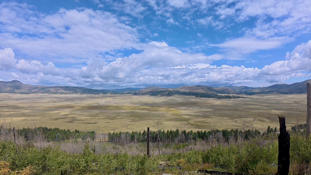 I was approaching the famous Valles Caldera. The Valles Caldera National Preserve encompasses 88,900 acres in the Jemez Mountains of north-central New Mexico. This landscape was created by a spectacular volcanic eruption approximately 1.2 million years ago that formed one of the largest calderas in the world. The caldera remains dormant but not extinct, still displaying signs of volcanic activity through hot springs and sulfuric acid fumaroles. The distinctive landscape features large grassland meadows (valles in Spanish) surrounded by rounded, forest-covered volcanic domes.