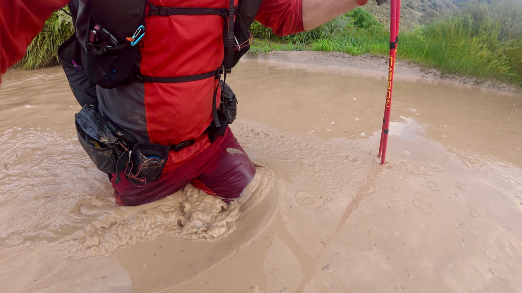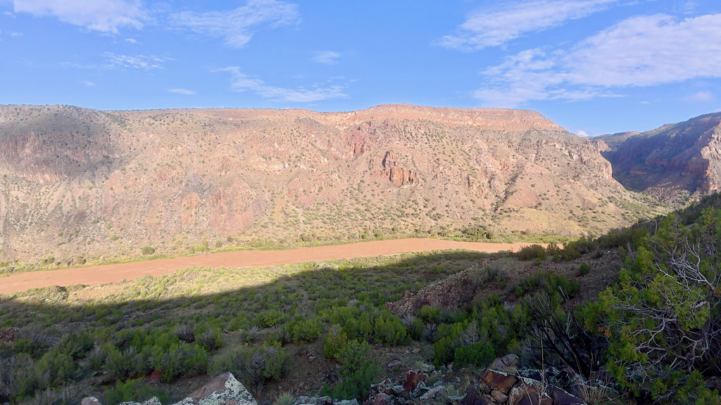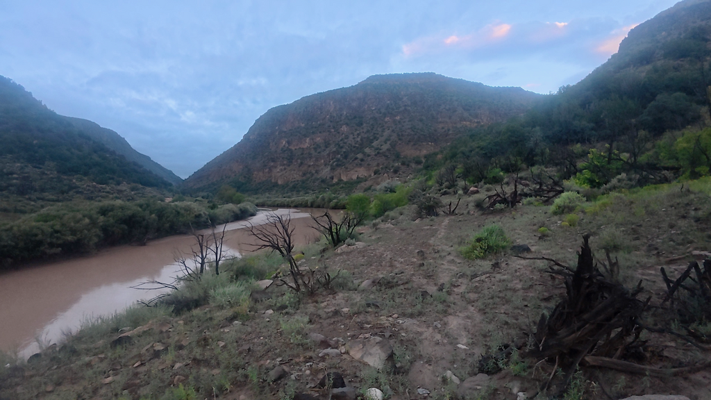 Everything remained wet the next morning, including my sleeping bag and insulating layers. But this was hopefully the final day, so I wasn’t overly concerned about gear drying time. After some road walking that allowed me to dry shorts and shirt in the pre-dawn hours, I began the descent into the Rio Grande canyon for my final encounter with the river that had been a central character throughout this journey. I expected this unbridged crossing to be similar to my first one near Taos—straightforward and manageable. I was completely wrong. Even in darkness, I could hear the Rio Grande clearly—a loud, rushing sound that immediately indicated high water levels. This was bad news. The route follows the river for several miles, and as daylight revealed the full situation, I could see a wide, brown, turbulent mess. This crossing looked substantially more serious than I had anticipated or prepared for. It took over an hour to reach the designated crossing point, during which time my anxiety continued building. When I finally made my first attempt, I immediately stepped hip-deep into thick mud and became thoroughly stuck. Fortunately, I had tightened my shoes in anticipation of muddy conditions, but the situation was far worse than expected. I struggled to extract myself on hands and knees without losing my shoes entirely.