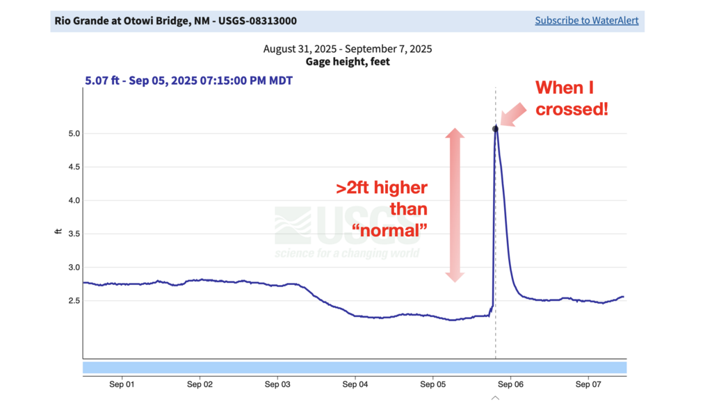 Only after arriving in Santa Fe and checking the online Rio Grande flow data did I realize I had crossed during peak flow conditions—the water was almost 3ft higher than the levels during previous days. The peak flow was probably directly attributable to the intense rainfall throughout the area during the previous night. Under normal conditions, the crossing would have been manageable. Under flood conditions, it felt genuinely hazardous and was probably borderline irresponsible to attempt.