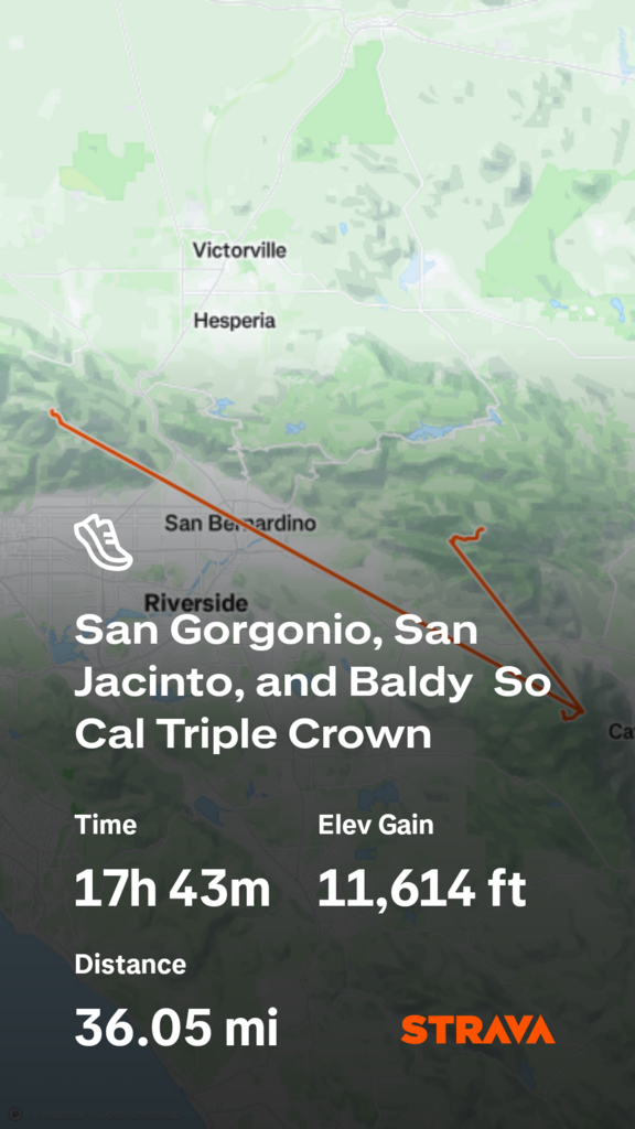 Jose and I started from Vivian Trailhead at 4:02am. We summitted San Gorgonio and then drove to the tram at San Jacinto. We took the tram up, started the climb at 12:34pm, and summited San Jacinto. We then drove to the Manker Flat Trailhead and started the climb at 6:06pm. We summited Mount Baldy via the Ski Hut. We finished all three peaks in 17hrs43mins30secs including driving time.