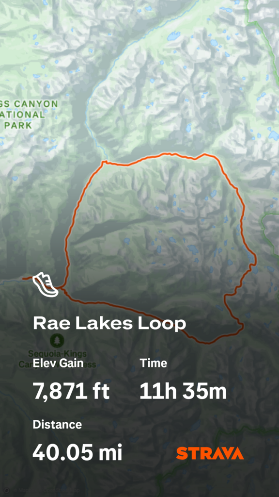 I started from Roads End at 5:37am. I carried my nutrition, a water filter, and was supported on the route by Jose. The water filter allowed me to carry minimal water and filter at the streams and lakes. My favorite part was going over Glen Pass. I did the route in a counterclockwise direction, it was 40 miles with over 7800'of gain in a total time of 11hrs 35mins16secs.