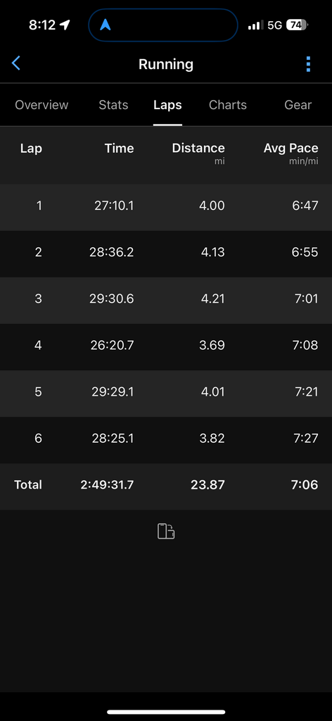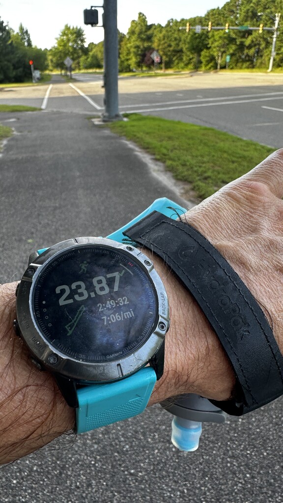 Having visited family in Myrtle Beach for the last 30+ years, and as a three time finisher of the Myrtle Beach marathon, I was excited to see a local FKT. I finally found a visit that I had a weather and time window to give the current record a run on July 17, 2025. For this attempt, I decided to run in the same direction and start as the current record did. I parked at a local hotel and walked to the corner of Grissom Parkway and Harrelson Boulevard. I set an early start time because of the summer sun and high humidity/dew point. So, at 4:54 am, I set out in the counterclockwise direction to take advantage of a slight headwind breeze for the second half. There were public water fountains along the boardwalk just when I thought I'd run through my initial supply of a handheld flask and two smaller hip flasks. The first few miles were much darker than I had anticipated and I would have benefited from a headlamp—but was familiar enough with the route. Although those first 6 miles were well traveled, they were definitely less scenic routes. There were a few crossings over 17 that slowed things a bit, but early in the morning was not so bad. I missed a turn on Ocean Blvd, but recalibrated a half of a block later to get back on course. Once along the ocean, the breeze was critical and water fountains popped up at the perfect time at the boardwalk— which was a nice break from the streets. After leaving the boardwalk, it was a long stretch on busy streets and the sun came out in full force from the airport to the finish, with just enough shade. With the sun being out, I spent the last few miles pacing myself to finish in 2:49:32. Overall, this was a nice route, especially for anyone familiar with the marathon course and a bit of nostalgia enough to enjoy the run.