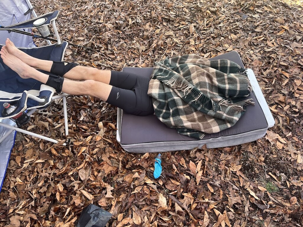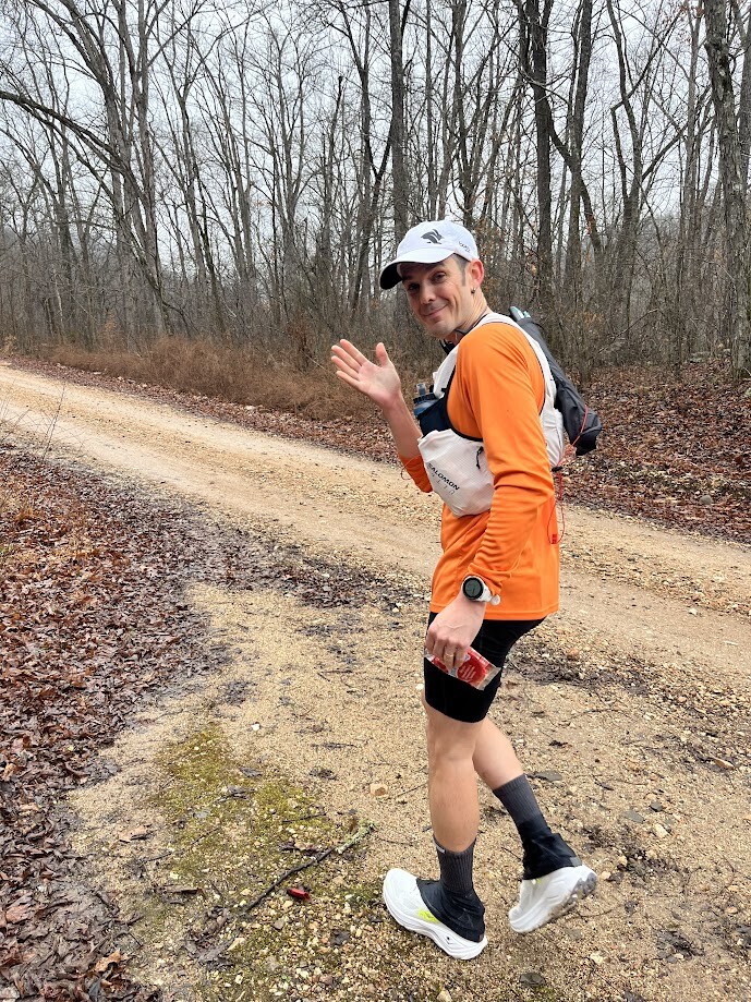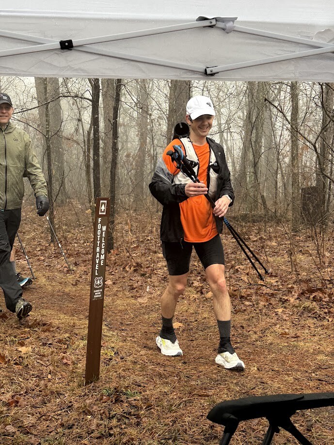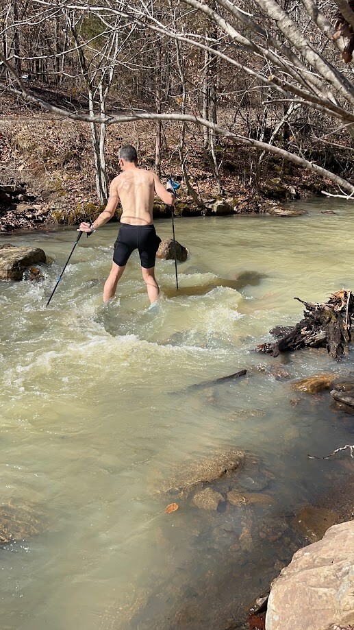 I started at the Woolum Sign at 6:05 am on Saturday morning, 2/14/26. I crossed the Buffalo river in sandals and changed into running shoes on the other side. I wanted to keep my feet dry for as long as possible. This ended up being a good idea because it was one of the only sections where I had dry shoes. By the time I got tor Richland it had started raining. It would continue to rain all day and most of that night. I met my wife at Richland to refill my bottles and food and set off for Fairview alone in the rain. I was met about 3 miles out from Fairview by Derek Scott who paced me in. From Fairview to Haw Creek I was paced by Randall Bright. By this time the rain had started to cause the creeks to rise quite a bit and I was having difficlty navigating some of the larger ones. I did not have to use the high water route around Hurricane creek however. From Haw Creek to Ozone I was paced by Chris Berry. From Ozone to Arbaugh I was paced by Erich Washousen. About 8 miles out from Arbaugh my watch died. I charged it from Arbaugh to Lick Branch and it ran the whole rest of the time. The submitted gpx file for part 2 is from Erich's watch. I was pretty dead when I got to Arbaugh. It was just after sunrise but it was still cloudy and misty and my feet were hurting pretty bad. This was the first time I had to sit for a while to dry my feet and recooperate. Once the sun broke through the clouds I began to feel much better and was able to pick up the pace a little. The section to Lick Branch from Arbaugh has a lot of downhill and didn't have any high water crossings until the very end so that helped a lot as well. My wife Laura paced me for this section and that was a great boost to my mental state as well. When I got to Lick Branch the crew wasn't there. They didn't expect me for at least another half hour so I laid down and got a 30 minute nap here. Once the crew returned I was able to change shoes and socks and get more food and water. I did the Lick Branch to West Cobb section with Will Landreth and his dog. We arrived at West Cobb just before sundown on day 2. From here Erich paced me again to Cherry Bend. We climbed up Hare mountain and got to witness a beautiful horizon just after the sun had set. I still felt decent through this section and didn't have any major issues. From Cherry Bend I was paced by Jake Anderson for the next 20 miles. It was getting late into night 2 and I was starting to get very sleepy. This is when I began to fall asleep while hiking and needed to take several small naps. I took one at Ragtown Rd in the back of the truck for around 30 minutes. While climbing White Rock I was falling asleep again while hiking so I had to take a 10 minute dirt nap on the side of the trail. When we got to the road crossing at White Rock I took another 20 minute nap in the chair in front of the heater. Jim Tadel paced me from White Rock to the Old Locke Rd crossing. The sun came up about 20 minutes after we left and we were lucky enough to witness a beautiful sunrise from near the top of the mountain. It was made more beautiful by the fact that I knew I didn't have to run in the dark again! This section was fairly short with a lot of downhill so it went by well without incident. I was starting to have a lot of audio and visual hallucinations by this point. I was seeing faces and patterns in every rock on the trail. I would also see many other exotic things before they finally transformed back into normal rocks and trees. It was wild but kind of exhillerating actually. For the final 9 miles of the trail I was paced again by my wife Laura. It was a beautiful day for a hike around Lake Ft Smith. My feet were in a lot of pain and I couldn't move very fast but I knew I had time to get it done so we just enjoyed it and took it pretty easy. The crossing of Frog Bayou was a little scary. The water was knee deep and moving pretty rapidly. I had poles that helped but Laura did not and I was worried for her safety. She wouldn't accept my offering of a pole. We made it across and hiked the final section of the trail. We were greeted by Jim and my daughter Peyton a few hundred yards from the finish and she held my hand as we walked up the final hill to the trailhead at the Lake Fort Smith visitors center. I touched the sign at 12:12 pm on 12/16/26 and was officially done!