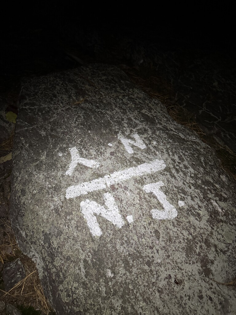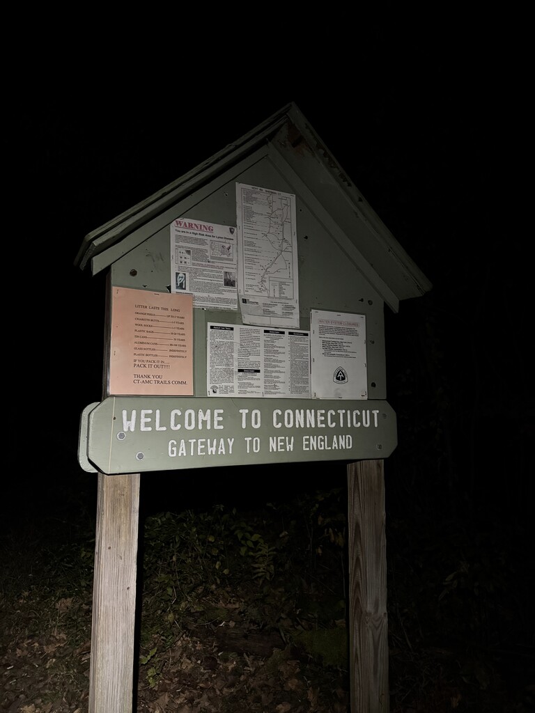I took a short break on the climb leading up from the bridge. The sun set as I walked up Canada Hill. After crossing Rt 9 at just over 42 miles, I decided to push to as close to 50 as I could. I had originally budgeted for two nights on the trail but had been moving so well on Day 1 that I knew if I could get more than halfway on the first day, there was a decent chance I’d find the willpower to finish in just one overnight. After about 48 miles, I decided to start looking for a good place to sleep. At that very moment, my headlamp beam illuminated a hand-painted sign proclaiming: “WARNING. FOUR BEARS LIVE HERE. PLEASE BE SAFE.” I put two more road crossings between me and what I hoped was the four bears’ very small living area, set up my sleeping bag, and took a long nap.