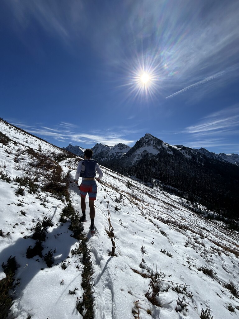 Cruising down Buck Creek was lovely, but some spots were overgrown and we had to hop over quite a few blowdowns on what would have otherwise been a really runnable descent. Crossing the Chiwawa River was simple and we kept our feet dry. There were streams along the entire route to get water. It was below freezing when we started, but the sun hit us around 10am and it turned into a really mild and sunny afternoon. We finished at 3:30pm.