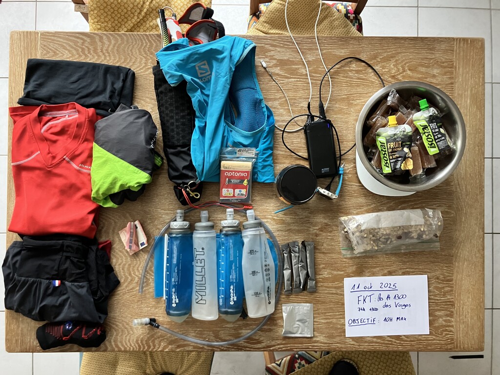 Je suis parti avec 4 kilos de matériel (nourriture comprise) et 3 litres d'eau sur moi, je me suis ravitaillé en eau à la Schlucht et au col du Hahnenbrunnen. Complètement autonome en pâte de fruits et en gel.
