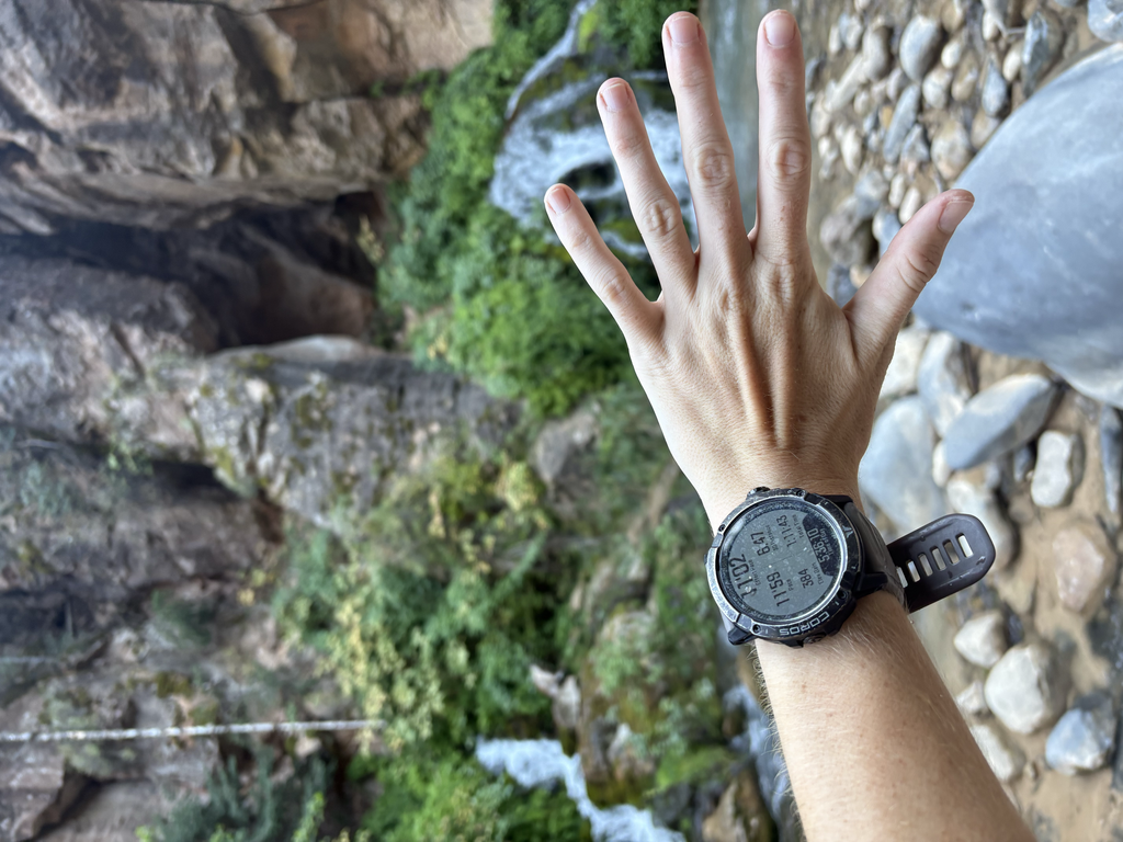 Watch didn't pick up a GPS signal at the trailhead or in the canyon (come on technology), but I took pictures of my watch at Big Spring (turnaround point) to verify I was there. Hopped off the shuttle at 4:24pm and started running. I was skeptical if I would make it out and back in time because the last shuttle down ran at 7:15. Missing it meant I would have to run 6+ miles down the road back to where my van was parked at the visitor center. I think going later in the day was the right strategy (albeit an unintentional one). Going earlier in the morning this time of year would have made for some pretty cold water, but it actually felt quite nice in the afternoon heat. There were still a lot of people in the Narrows this late in the day, but after I got past the split there was hardly anybody. I was the last person back there this day, which was pretty cool. Running on slick rocks and through water knee-waist high sure is an adventure!