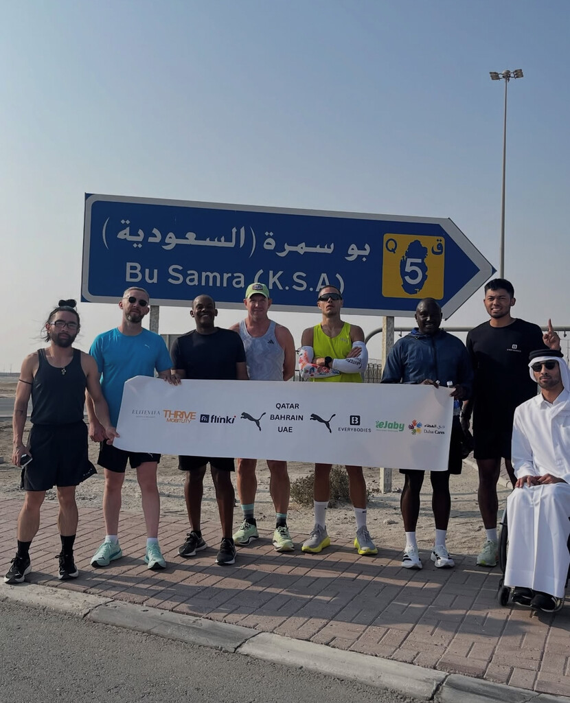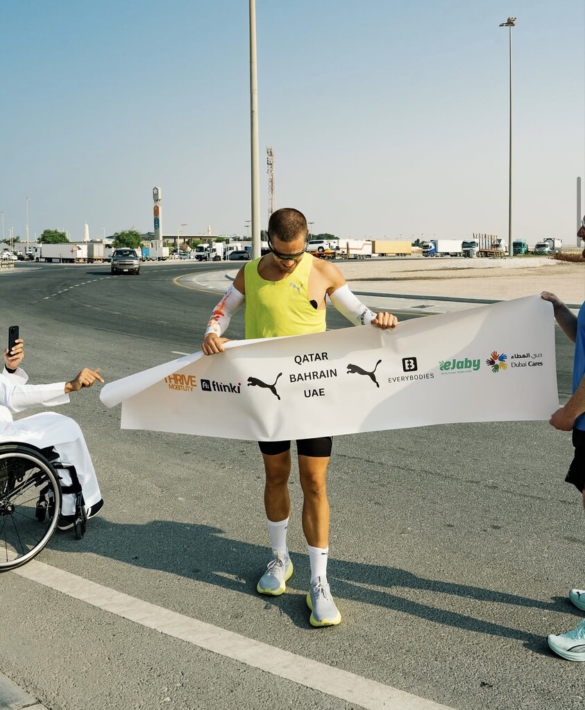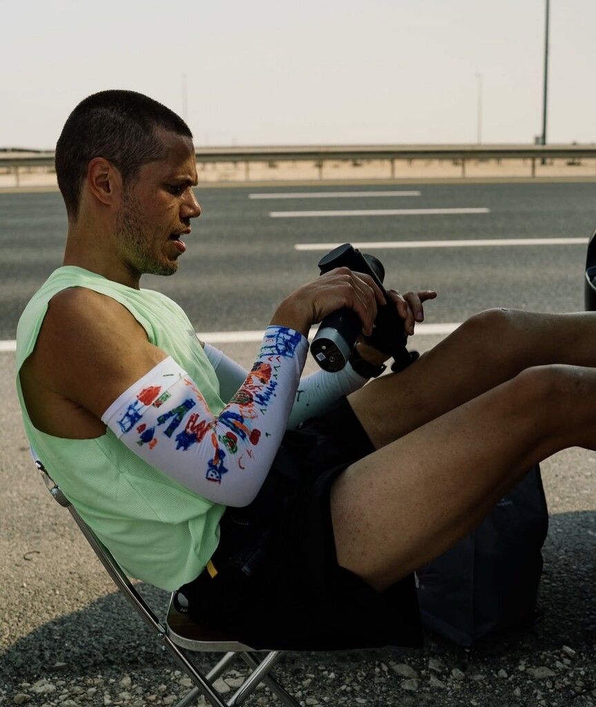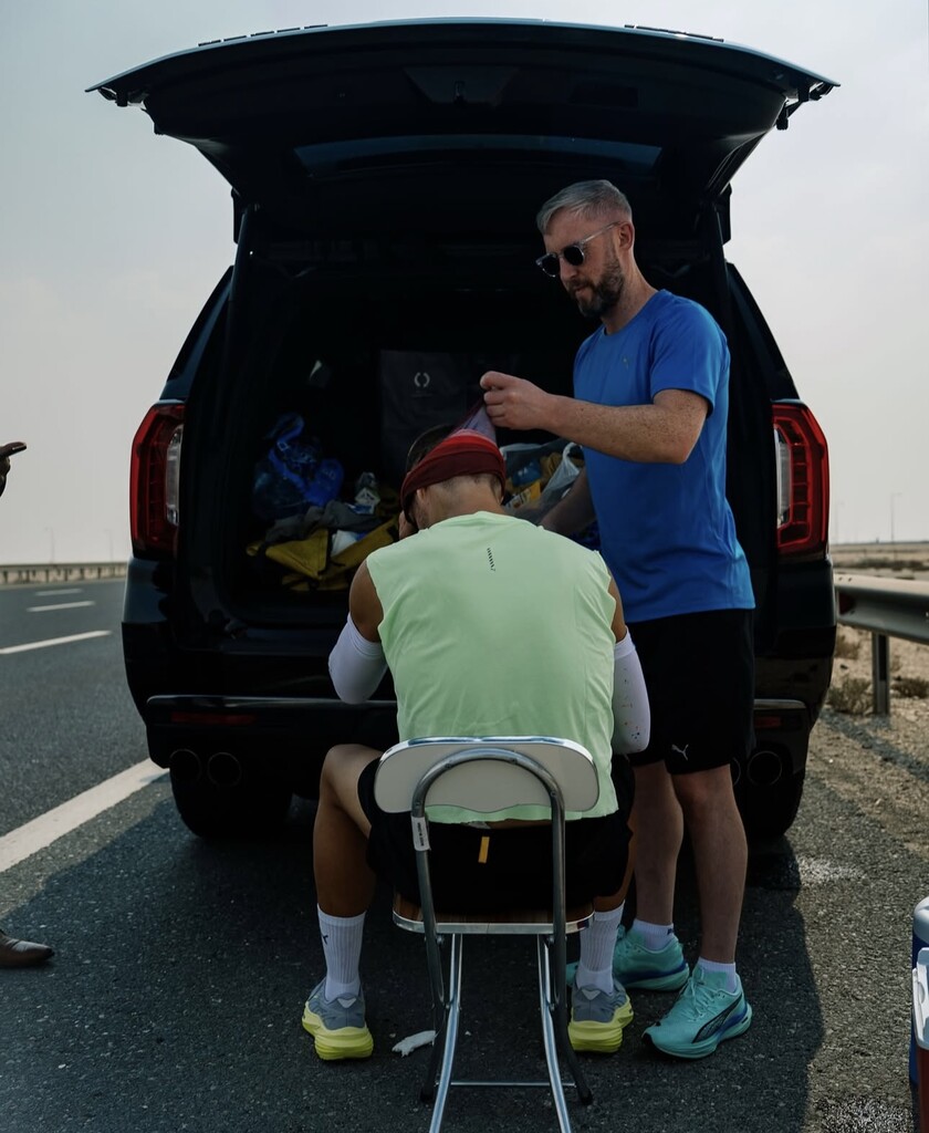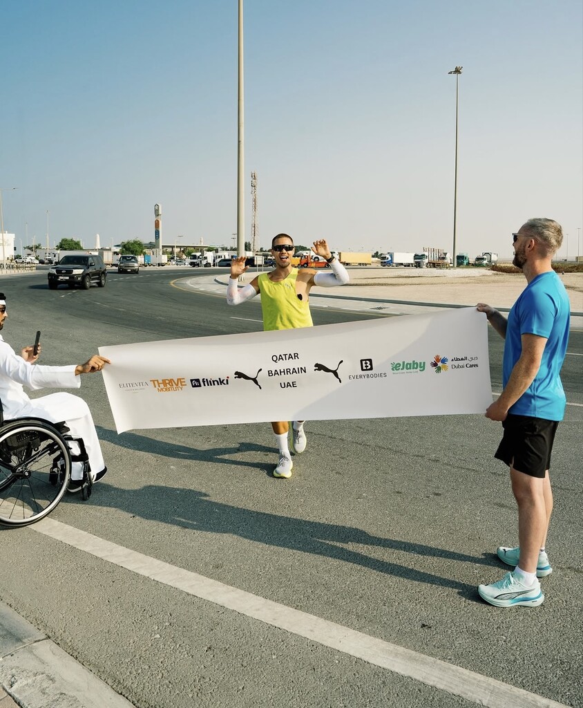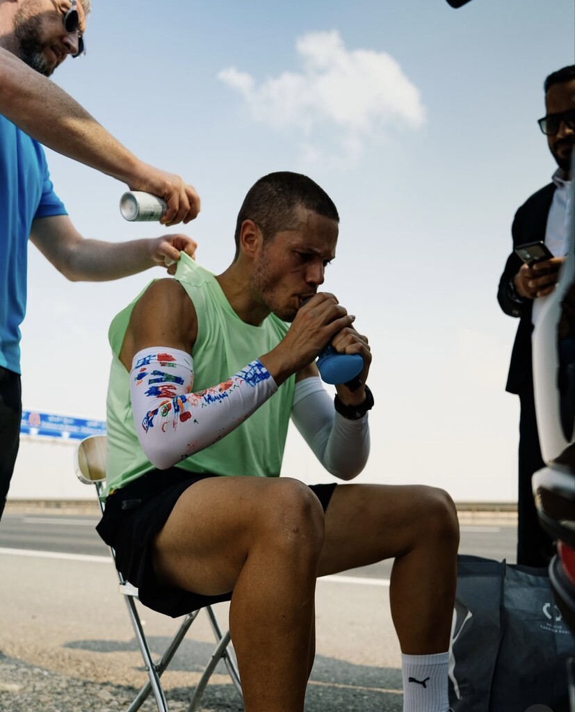 I was fully supported by a crew for safety, pacing rotation, nutrition, hydration, and logistics. In the final 10 kilometers, I was joined and paced by the Salwa Striders, a local running community who accompanied me through to the finish. I was also supported by Ahmed Al-Shahrani who holds the current record for the fastest crossing of Qatar (same route) in a wheelchair.