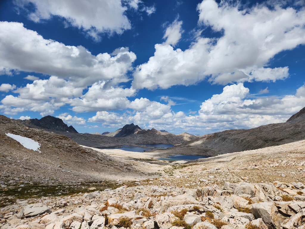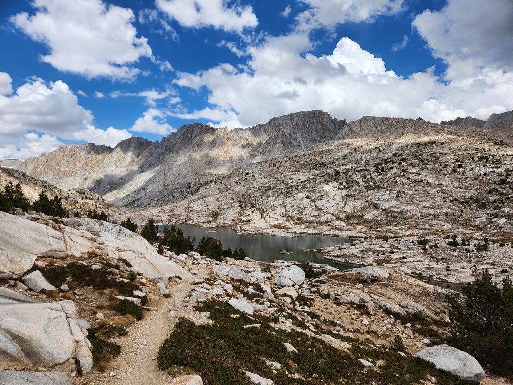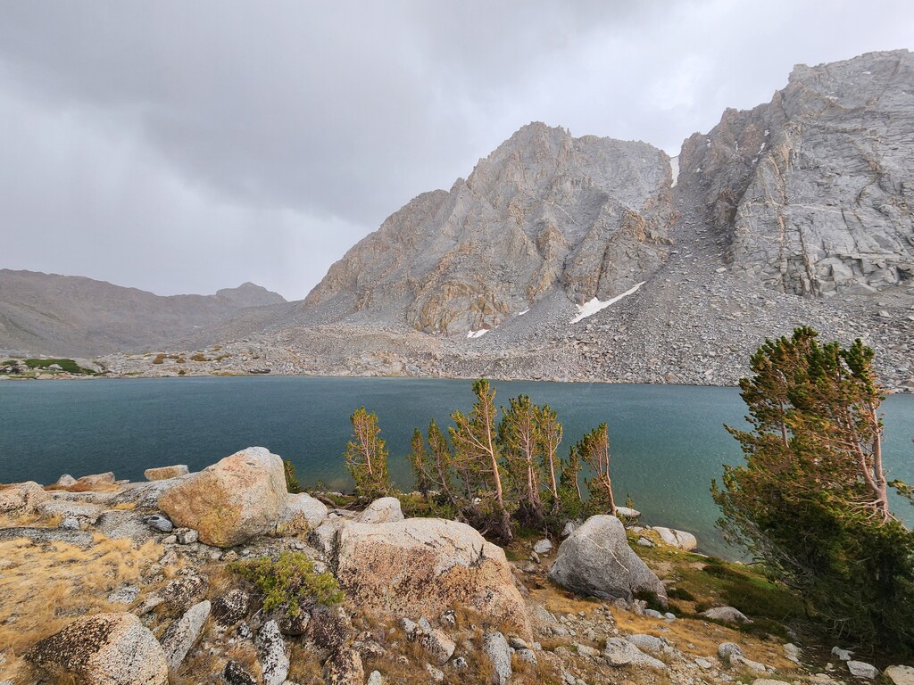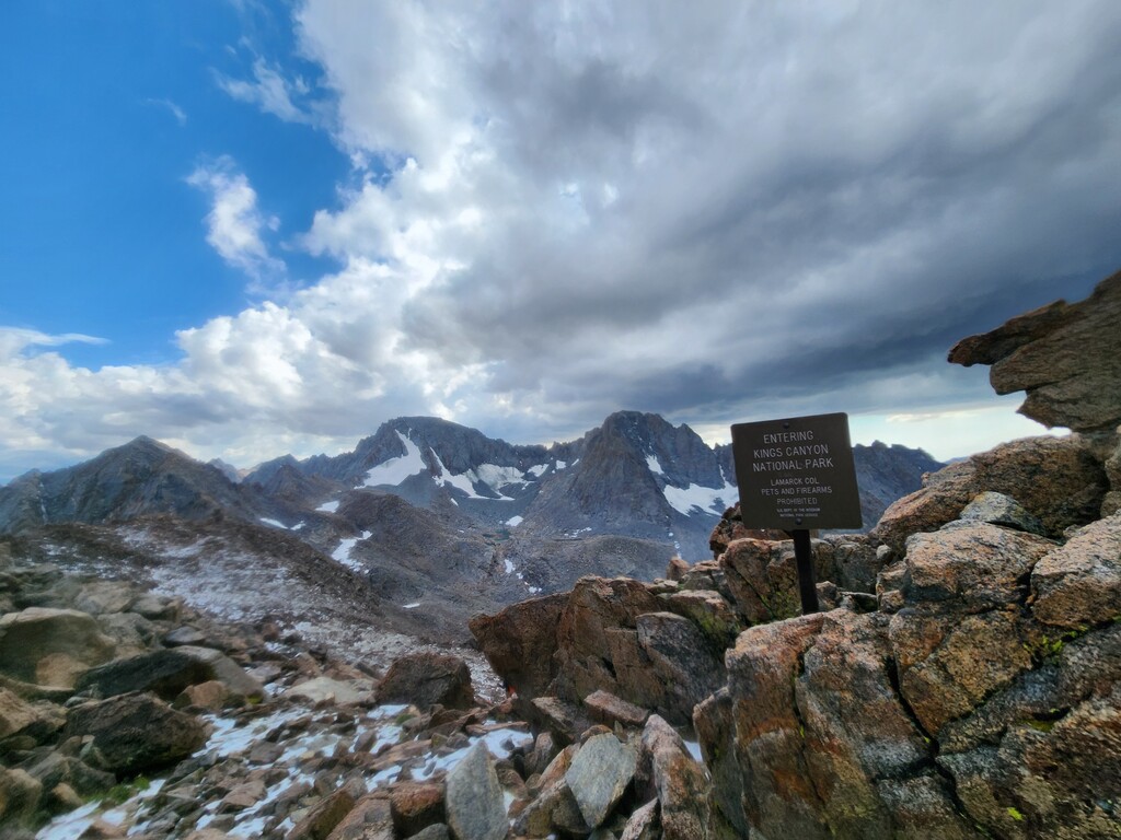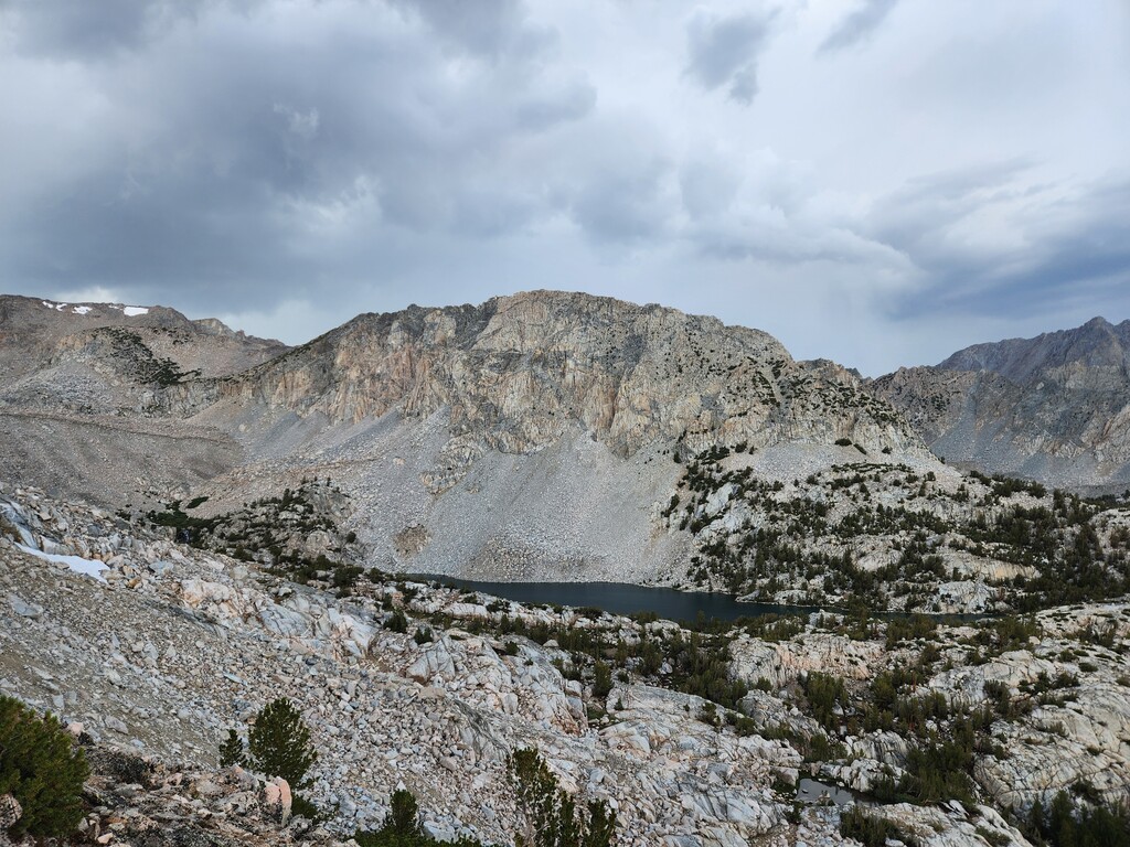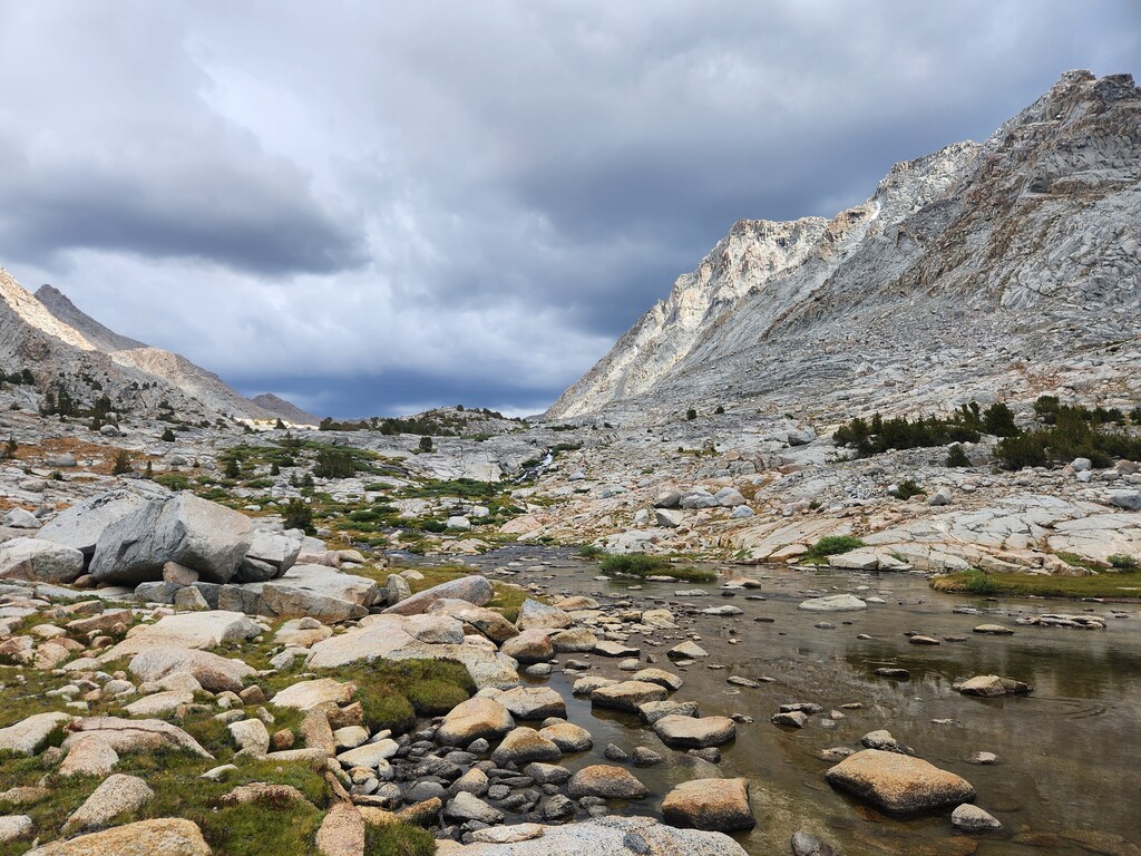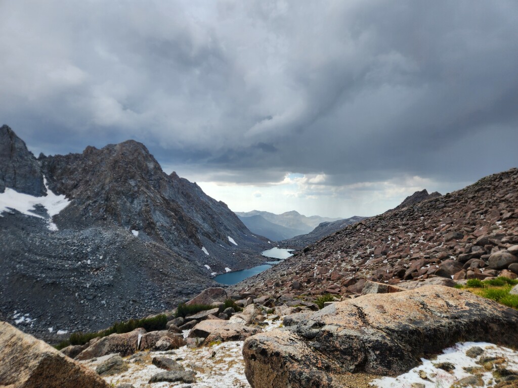 I had an unexpected extra challenge and spice on this day because I was hit by a massive thunderstorm as I made my way through Darwin Bench to Lamarck Col. Hail, flash floods, and lightnight striking the surrounding peaks and the Col itself...eeek. I ended up finding refuge under a tree and later a rock to wait it out. Luckily, it passed west and let me over the now hail laden Lamarck Col.