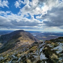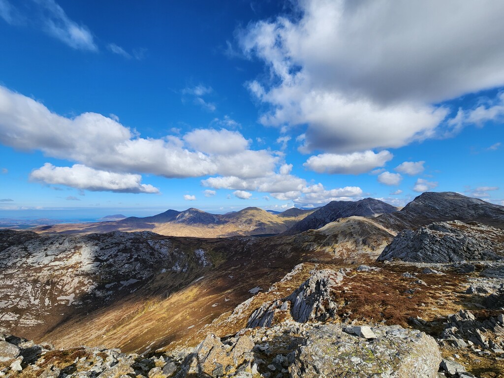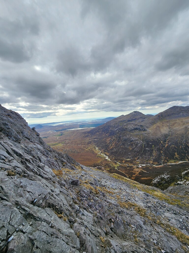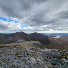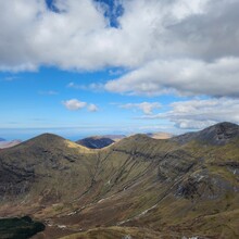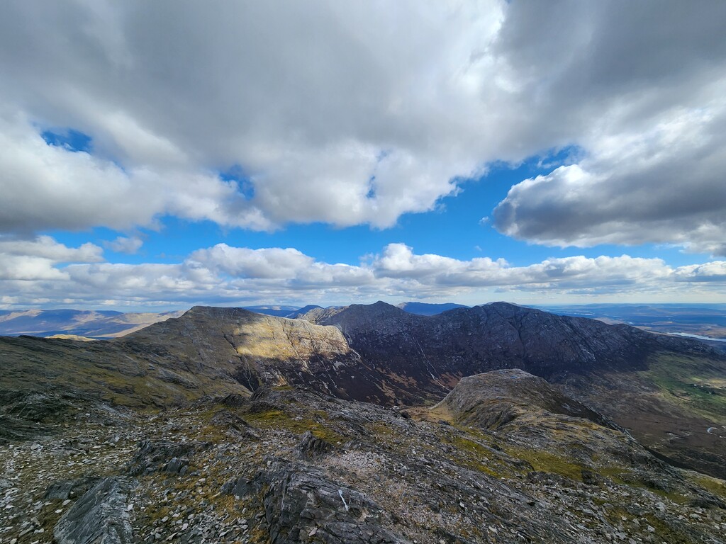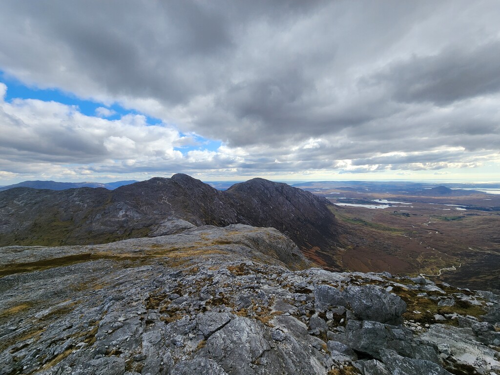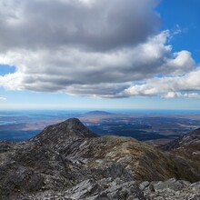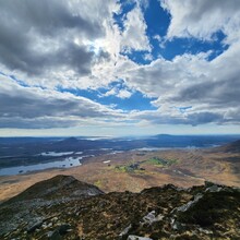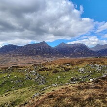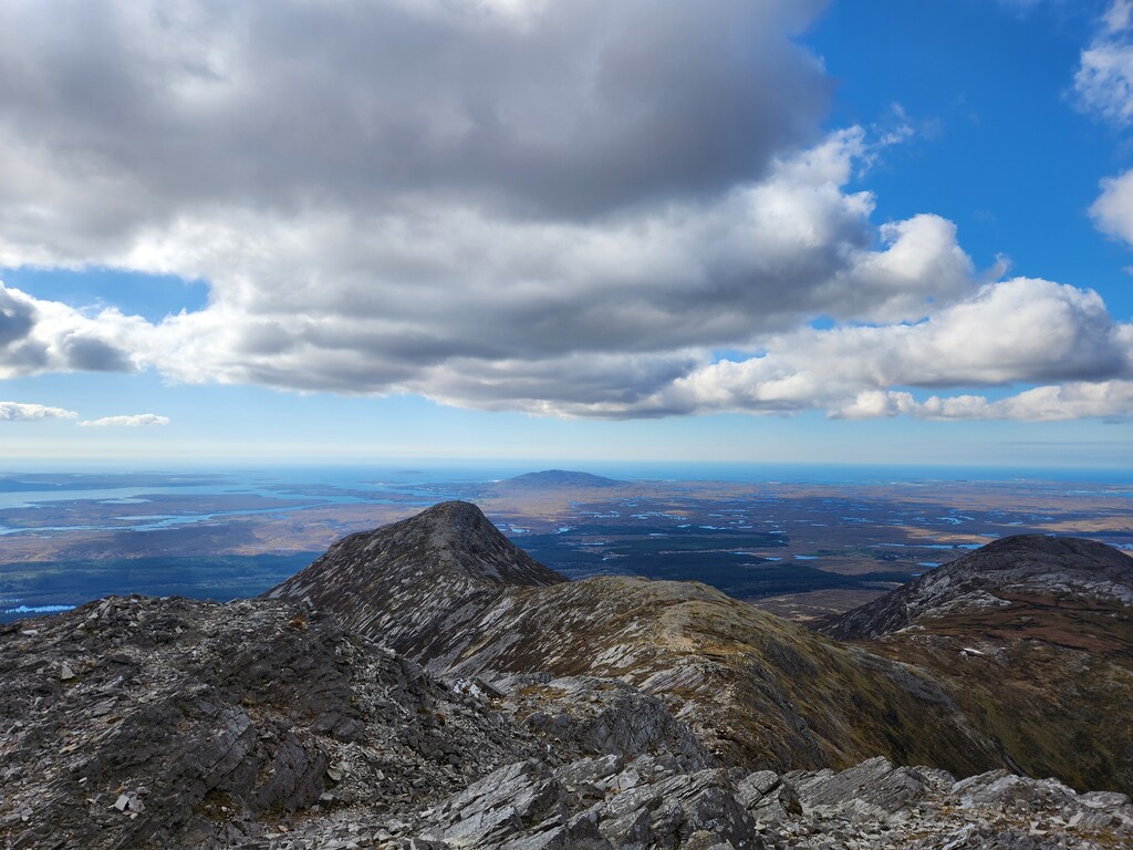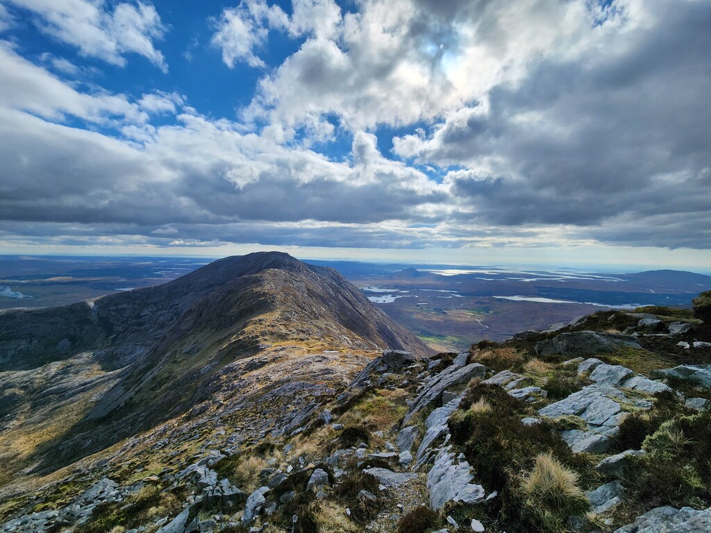 Amazing route! Rugged and almost all offtrail it has unrelenting vert that starts right away and doesn't let up. Right out the gate it heads straight up to Benlettery peak from the hostel, rising nearly 2,000 feet in 1.3 miles, to gain the long ridge. I stayed atop the ridgeline all the way around to Derryclare hitting all the high points along the way, including Benbreen, Benbreen central, Benbreen north, Bencollaghduff, Bencorr and many subpeaks. Not a lot of efficiently runnable sections were found due to the steep ups and downs; the route rinding; and the combination of uneven rock, thick grass and bog. A few highlights were the numerous rocky scrambling sections (my favorite was the consistent blocky quartzite steeps coming up Bencorr), a small heard of sheep way up high on Benbreen north, and of course the incredible views in both direction from the ridgeline. I was also really lucky to do this route on a sunny, calm day which is rare for March.