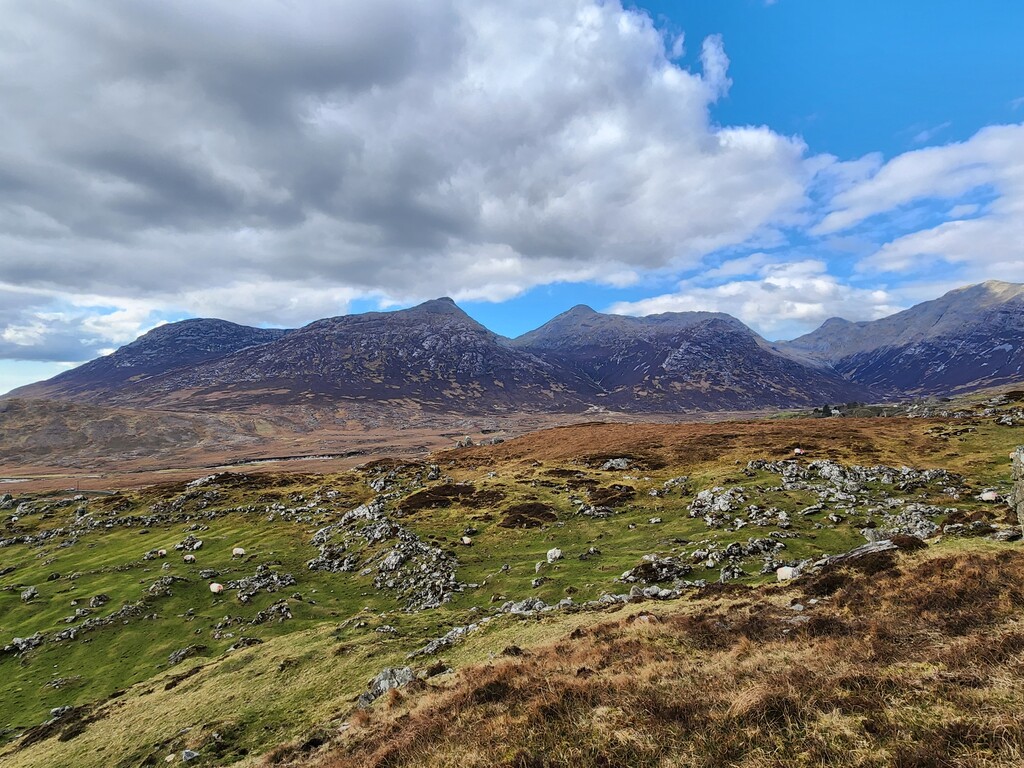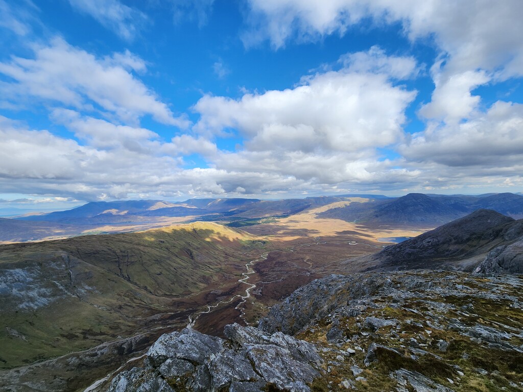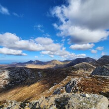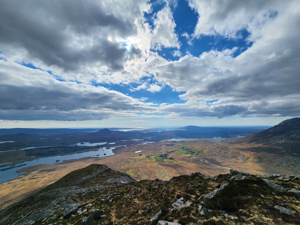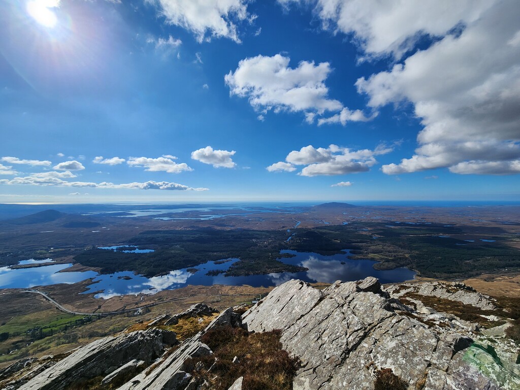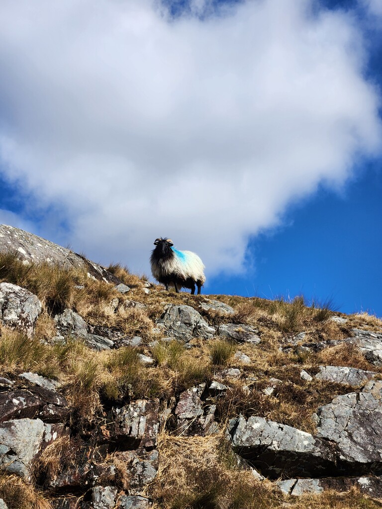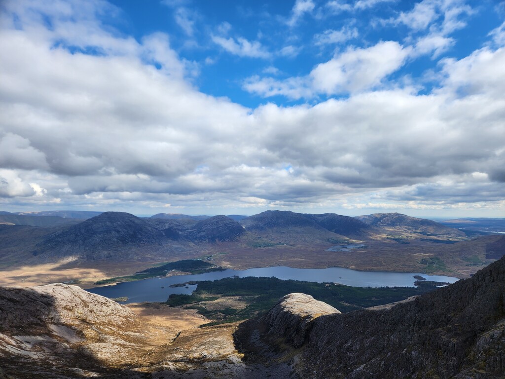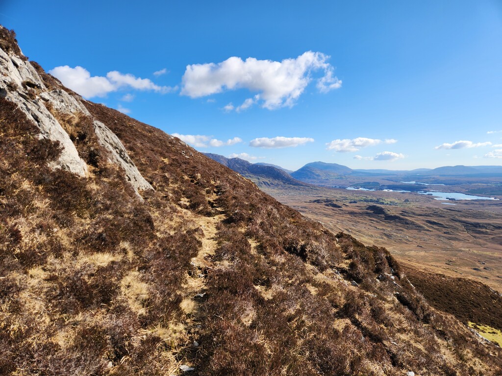 Amazing route! Rugged and almost all offtrail it has unrelenting vert that starts right away and doesn't let up. Right out the gate it heads straight up to Benlettery peak from the hostel, rising nearly 2,000 feet in 1.3 miles, to gain the long ridge. I stayed atop the ridgeline all the way around to Derryclare hitting all the high points along the way, including Benbreen, Benbreen central, Benbreen north, Bencollaghduff, Bencorr and many subpeaks. Not a lot of efficiently runnable sections were found due to the steep ups and downs; the route rinding; and the combination of uneven rock, thick grass and bog. A few highlights were the numerous rocky scrambling sections (my favorite was the consistent blocky quartzite steeps coming up Bencorr), a small heard of sheep way up high on Benbreen north, and of course the incredible views in both direction from the ridgeline. I was also really lucky to do this route on a sunny, calm day which is rare for March.