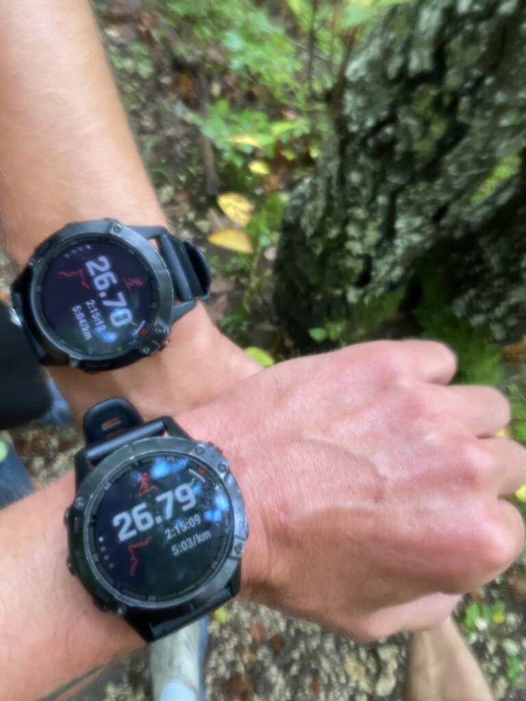 We (Jonas and Freddy) ran the whole trail together. We carried all our supplies by ourselves (about 0.5 l of water and 4 gels per person).