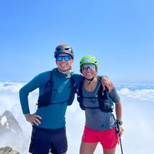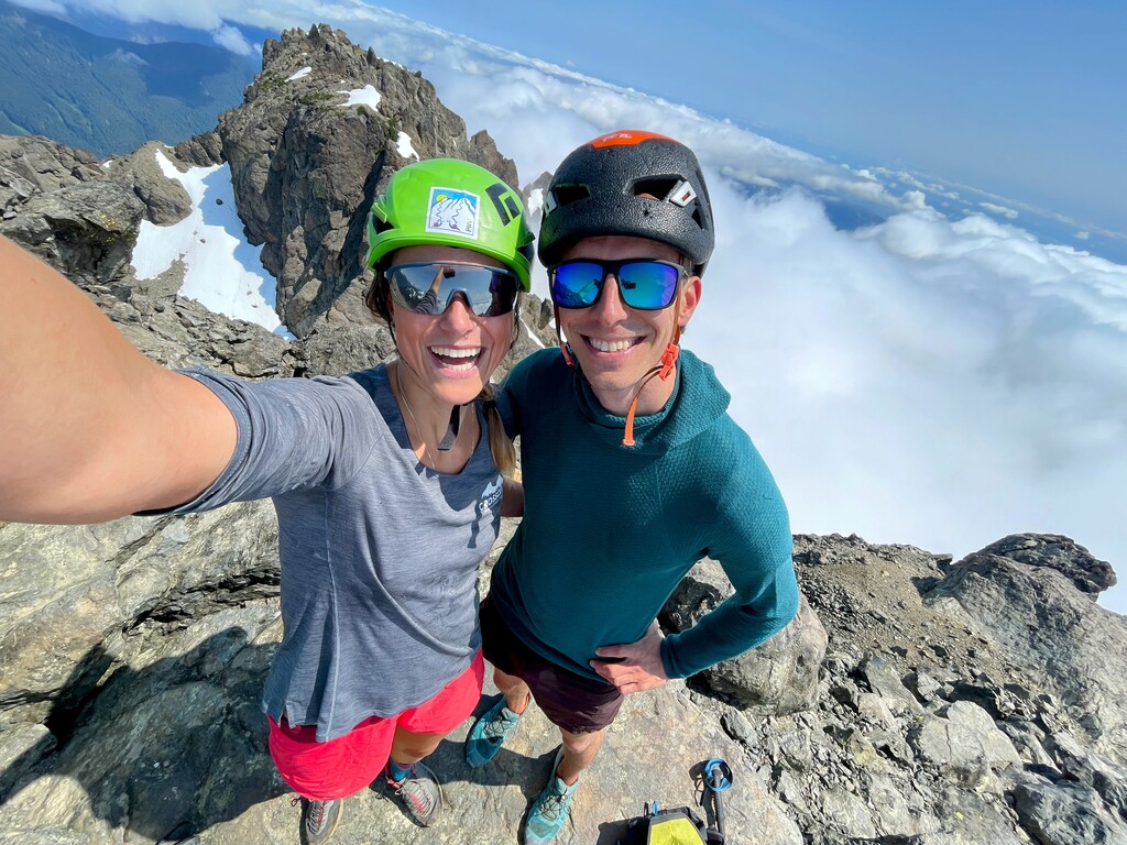 House-to-house push from Seattle - took a minute to wake up but then got in the groove of things. Both our first times up the Brothers, of course been staring at them for a long time from home. Foggy mid-mountain but bluebird on top, could see 5 volcanoes! A few hundred feet of scree, I wouldn't want any more than that, snow is much nicer.