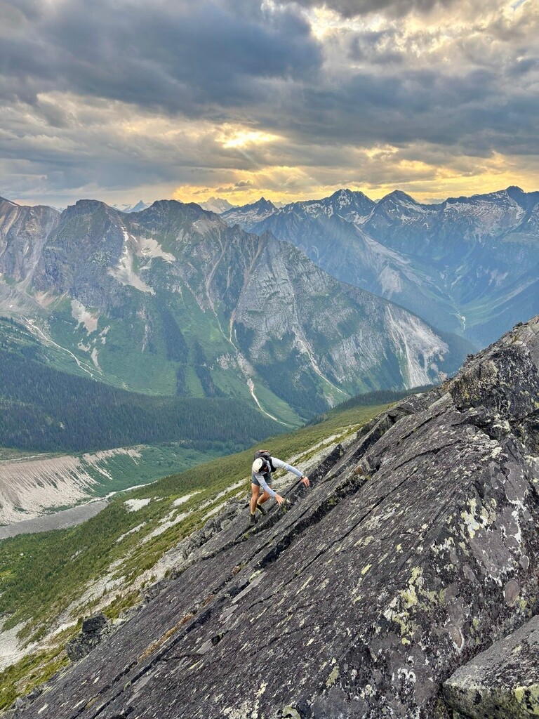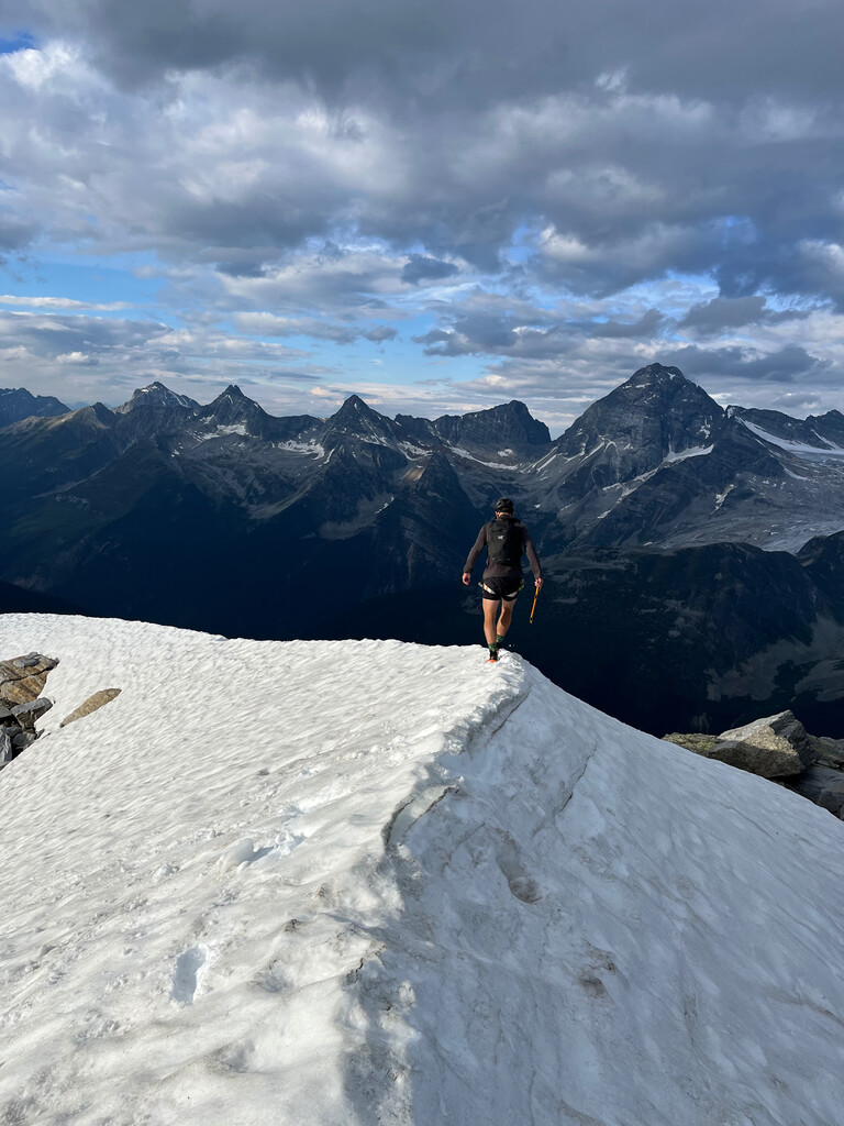 Crossing the glacier was tedious but uneventful with a deeply sun cupped surface. Caught one leg in a crevasse descending the face of Young’s Peak. Almost pulled the plug at Asulkan Pass, but decided to carry on with a reduced focus on setting an FKT and an increased focus on finishing off an already epic day. We both managed to find our second wind and thoroughly enjoyed the Asulkan Traverse, treated to great views, cool temps, and a brief but intense shower on Abbott Ridge.